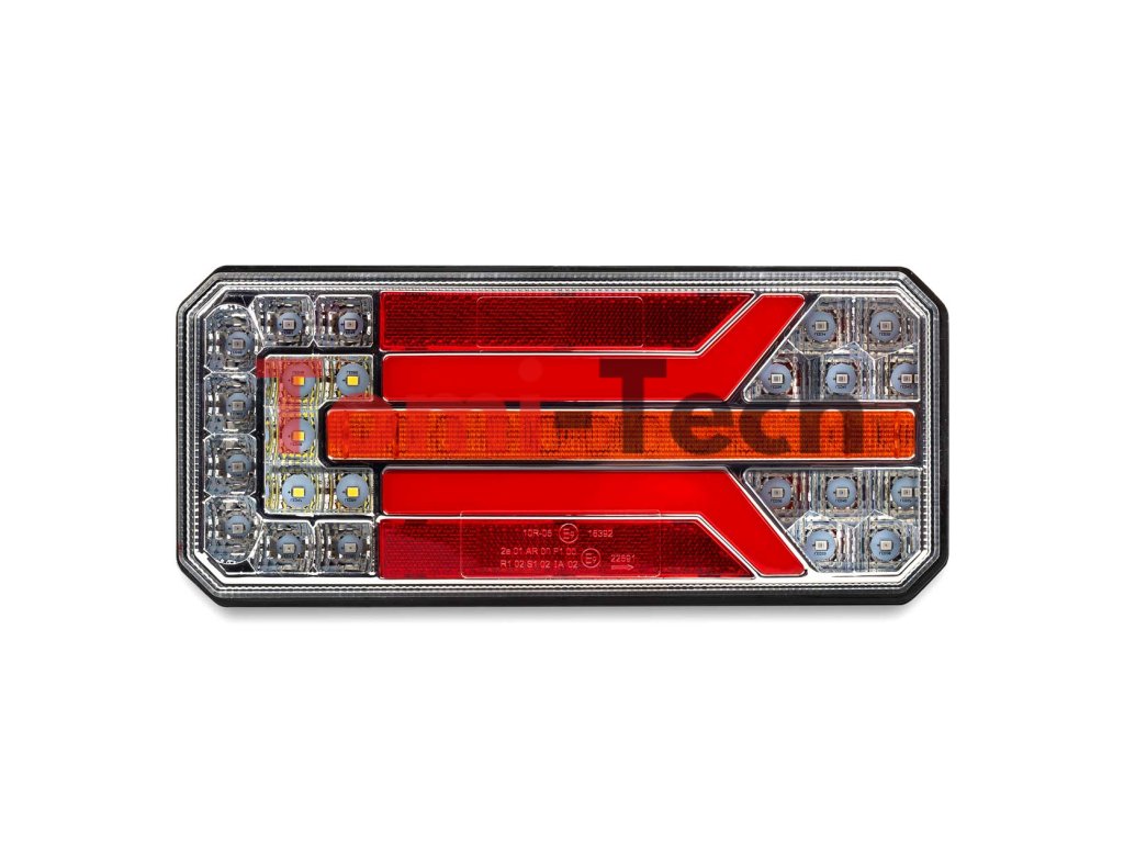 Ide o moderné LED zadné združené svetlo s výrazným tvarom pozičného svetla a dynamickým smerovým svetlom. Moduly LED pozičných svetiel sú vyrobené zo špeciálneho materiálu, ktorý ukryje jednotlivé svetelné body, iba tvar s príjemnou žiarou s neónovým efektom. Dynamická smerovka na druhej strane vytvára efekt cestnej smerovky, pričom každá LED sa rozsvieti s o niečo väčším oneskorením. Svietidlo je možné použiť v 12V aj 24V systémoch, je schválené EMC a má krytie IP 67. Toto je asi najkrajšia lampa na trhu. Pravé zadné kombinované svetlo LED s dynamickým smerovým svetlom. Technické údaje: Funkcie/svetlá: poloha, spiatočka, stop, smerovka, zadná hmla. Schválenie ECE E9 R10. Napätie: 10-30V DC. Vodeodolnosť IP67. Rozmery: 236x104x40 mm.Dodatočné parametre