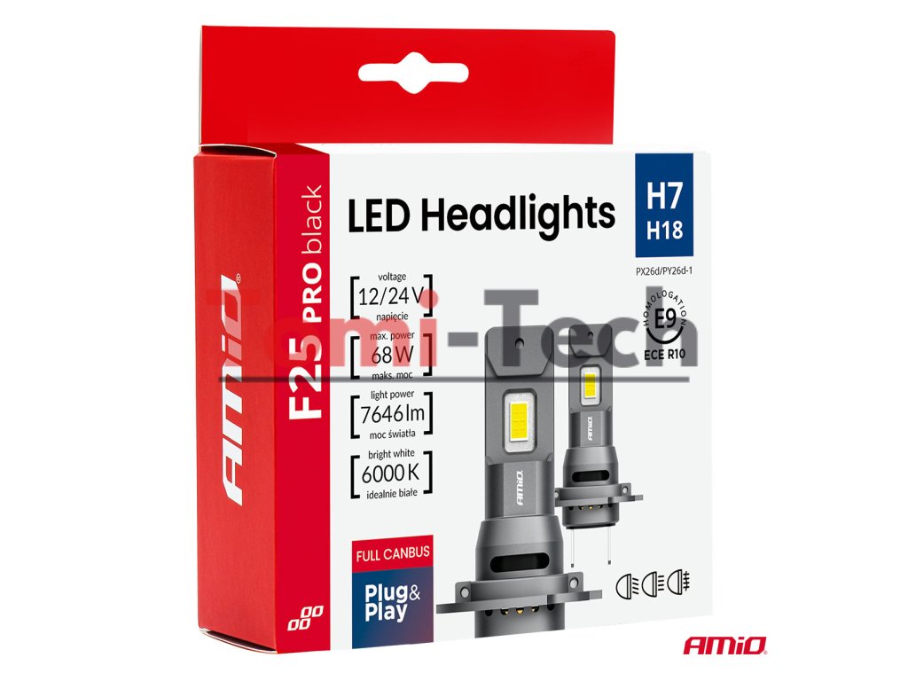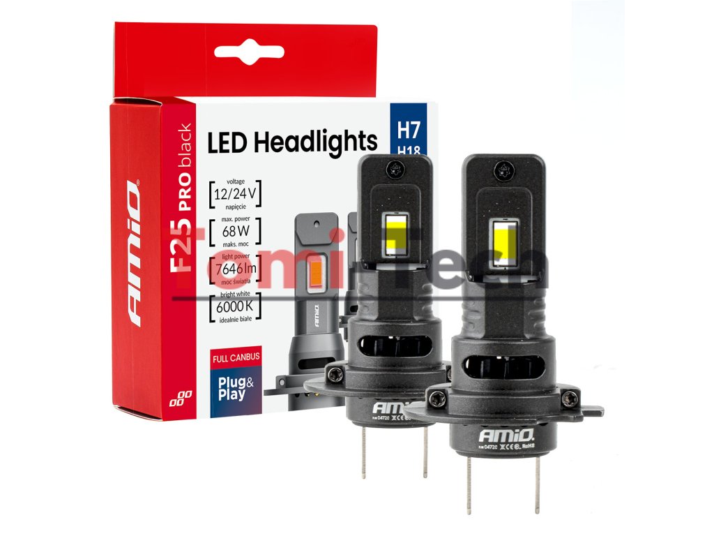 Žiarovky F25 PRO BLACK Edition H7 12/24V LED do svetlometov sú pokročilým zdrojom svetla určeným pre automobilové svetlomety. Sú vybavené systémom FULL CANBUS a zabezpečujú plnú kompatibilitu so systémami vozidiel vybavenými systémom monitorovania prepálených žiaroviek.F25 PRO BLACK Edition ponúka maximálny výkon 68 W a svetelný tok 7646 lm , čo vedie k mimoriadne intenzívnemu a rovnomernému osvetleniu vozovky. Teplota farby 6000 K poskytuje efekt denného bieleho svetla, čím zlepšuje kontrast a viditeľnosť.