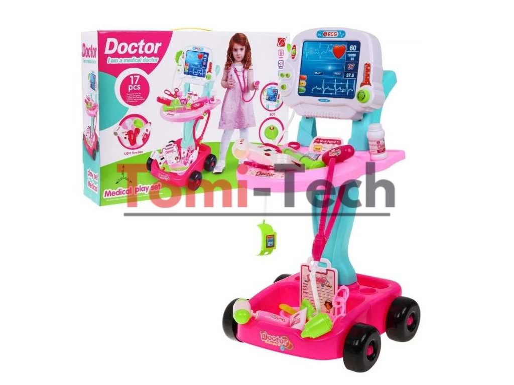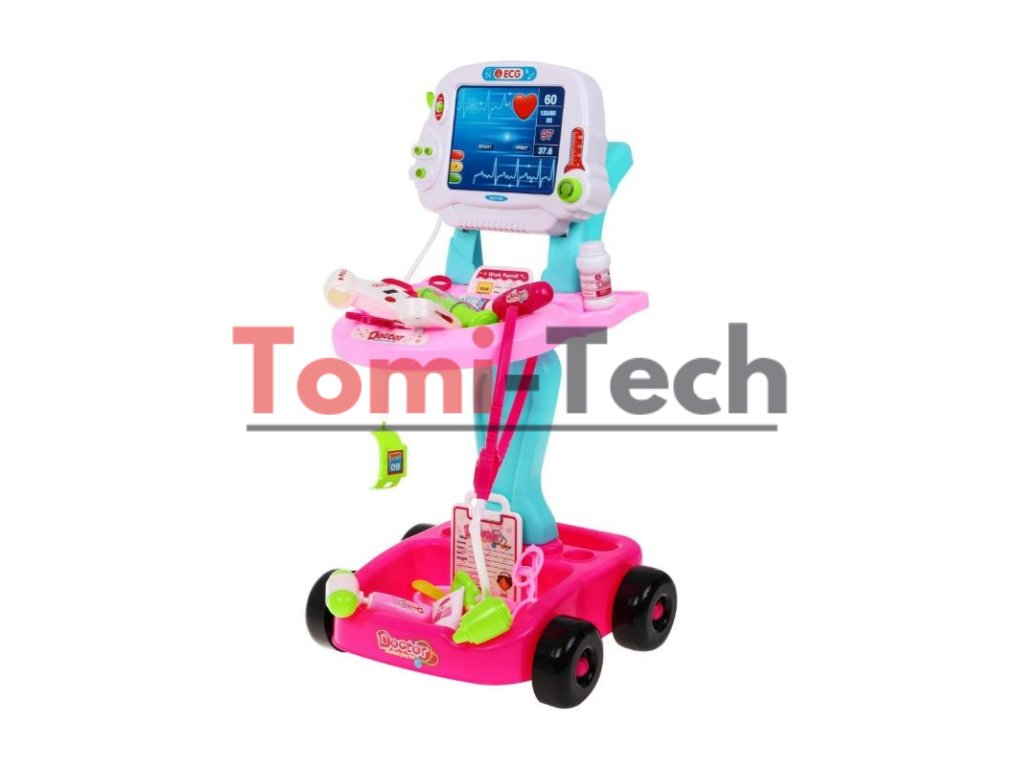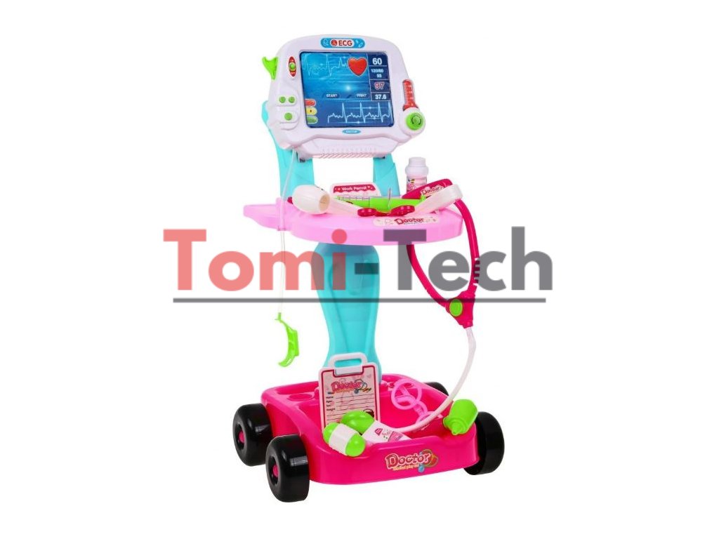 Obsah súpravy:vozík na príslušenstvo s policami a EKG prístrojom,stetoskop, ktorý vydáva zvuk tlkotu srdca a po dotyku s telom na ňom bliká srdiečko,sada farebných nálepiek,zubné zrkadlo s blikajúcimi svetlami (cca. 12 cm x 3 cm),laryngologický otoskop s lampou na nazeranie do uší a nosa pre pacienta (cca 12 cm x 6 cm),teplomer s podsvieteným výsledkom a možnosťou regulácie teploty (cca. 11,5 cm x 3 cm),injekčná striekačka (cca. 14 cm x 6 cm),pulzomer s podsvieteným výsledkom (cca. 12 cm x 5 cm),neurologické kladivo (cca. 12 cm x 6 cm),okuliare,skalpel (cca. 12 cm x 2,5 cm),2 x nožnice (cca. 12 cm x 7 cm),identifikačná plaketa (cca. 7,5 cm x 5 cm),karta pacienta (cca. 12,5 cm x 9 cm),oblička na lieky (cca. 12 cm x 6 cm x 2 cm),nádobka s liekmi, kvapkami, mydlom,tlakomer.