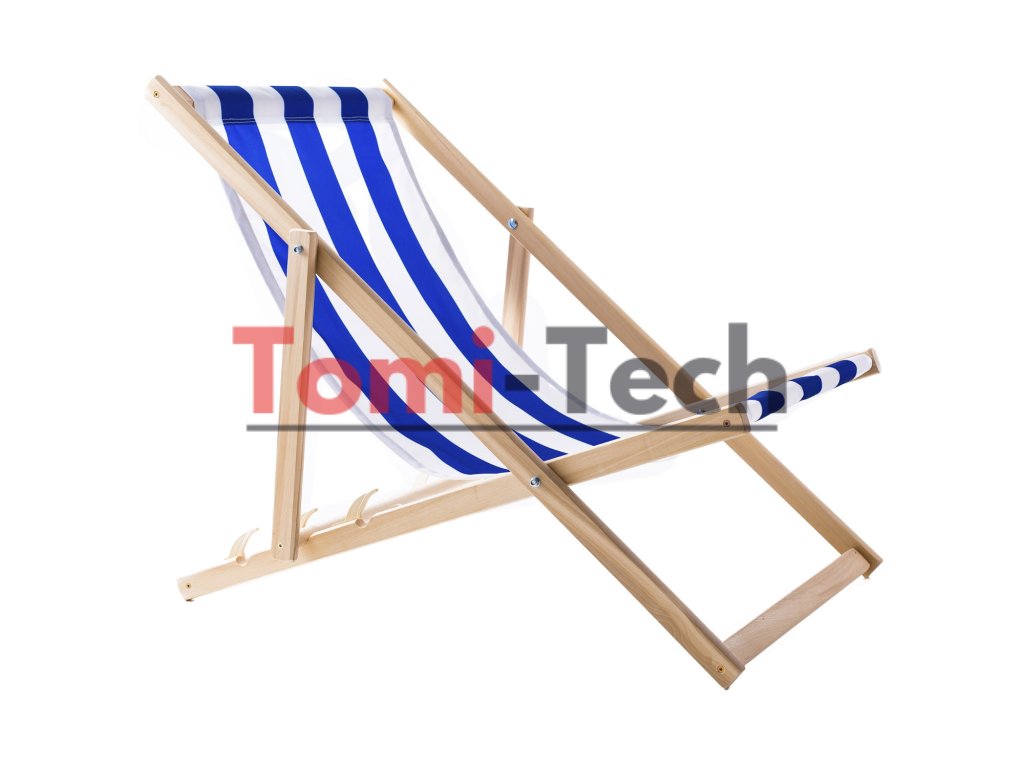 Drevené plážové lehátko s modrými pruhmi