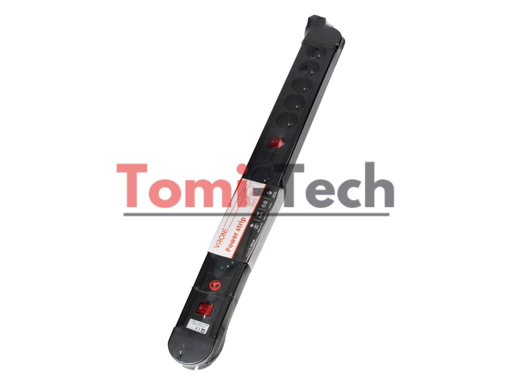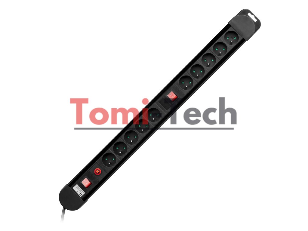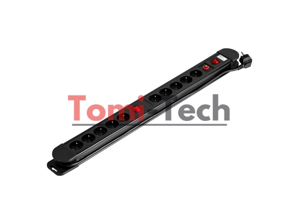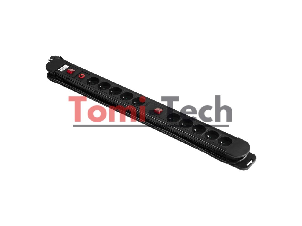 Predlžovacia zásuvka, 10 zásuviek 2P+Z, kábel 3x1,5mm2, dĺžka 1,5m, 2x podsvietené dvojpólové vypínače, tepelná poistka. 16A/230 VAC, čierna
