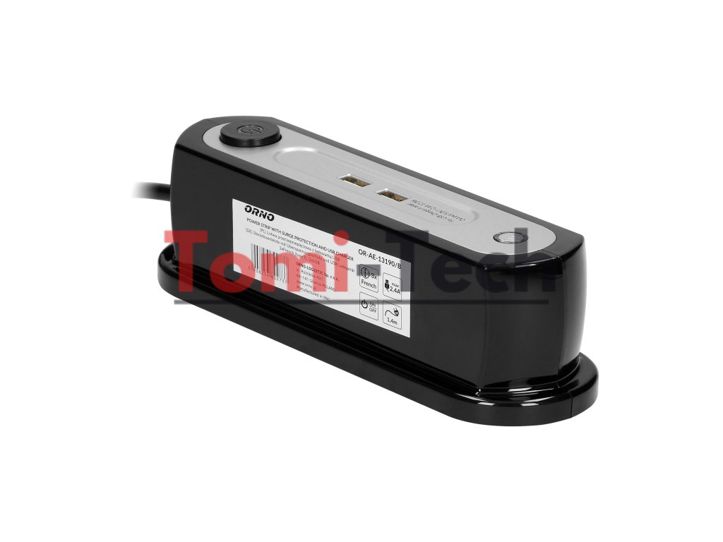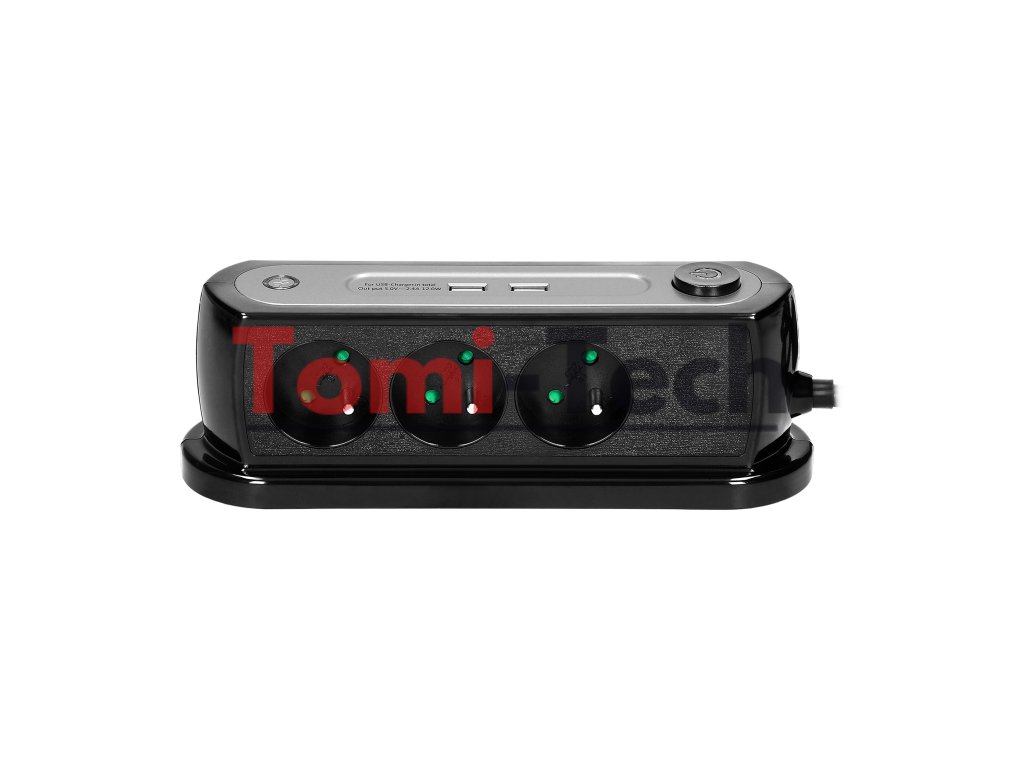 Stolný predlžovací kábel s vypínačom 3x2P+Z, nabíjačka 2xUSB 2,4A, prepäťová ochrana TYP 3, kábel H05VV-F 3x1,5, dĺžka 1,4m, čierny
