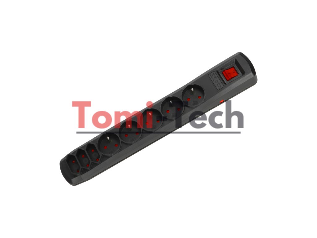 Ochranný prvok proti prepätiu a rušeniu v napájacej sieti. Medzi jeho vlastnosti patrí ochrana proti prepätiu a skratu, 5 zásuviek s uzemňovacím kontaktom (10A/250V), 3 ploché zásuvky bez uzemňovacieho kontaktu (2,5A/250V), bezpečné, nevodivé, samozhášacie puzdro, indikácia prevádzky, automatická poistka s časovým oneskorením a jednoduchá montáž na povrch. Technické údaje: - menovité napätie: 230V, 50Hz - maximálne zaťaženie: 10A (2300W) - menovitý prúd: 10A - spotreba energie: 155J - čas odozvy: <25ns - max. impulzný prúd: 6000A (prepätie 8/20 μs)Dodatočné parametre