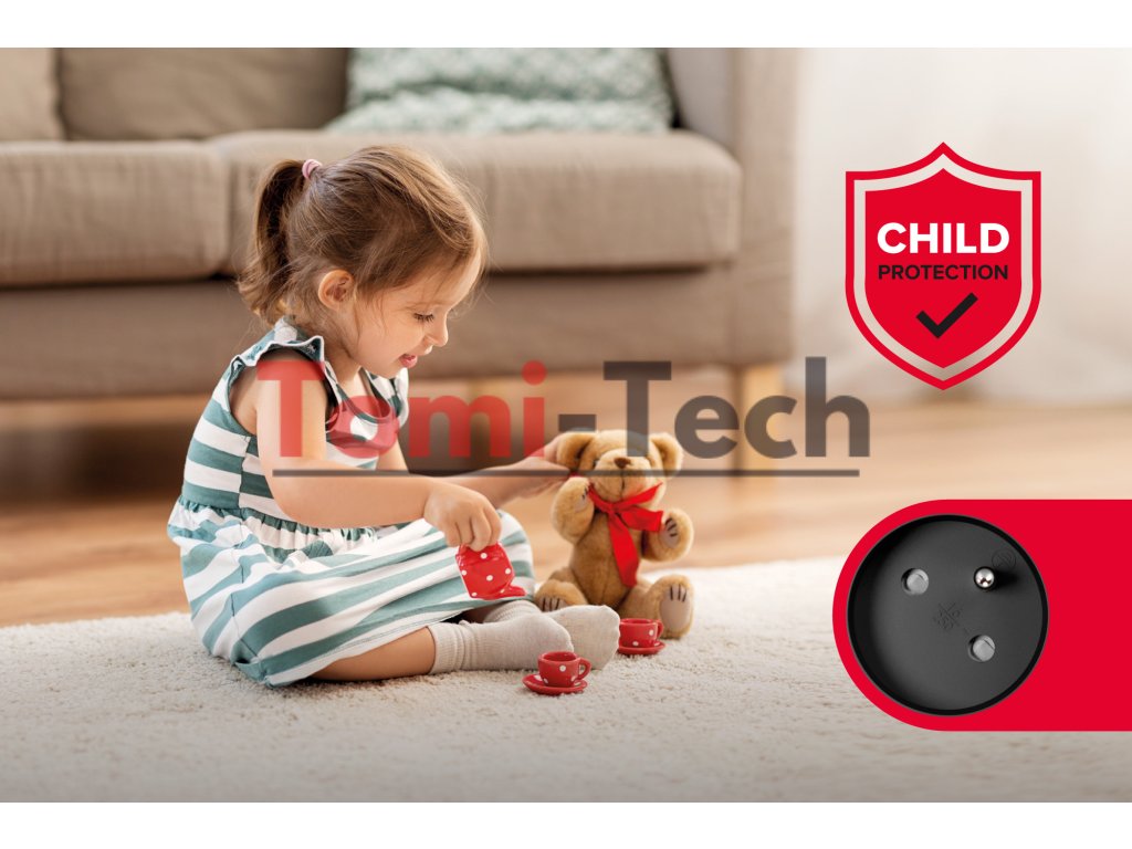 Predlžovačka Rebel je vybavená vstavaným ochranné kryty kontaktov v elektrických zásuvkách. Účinne chránia zdravie a život detí a chránia ich pred vkladaním prstov alebo iných predmetov.