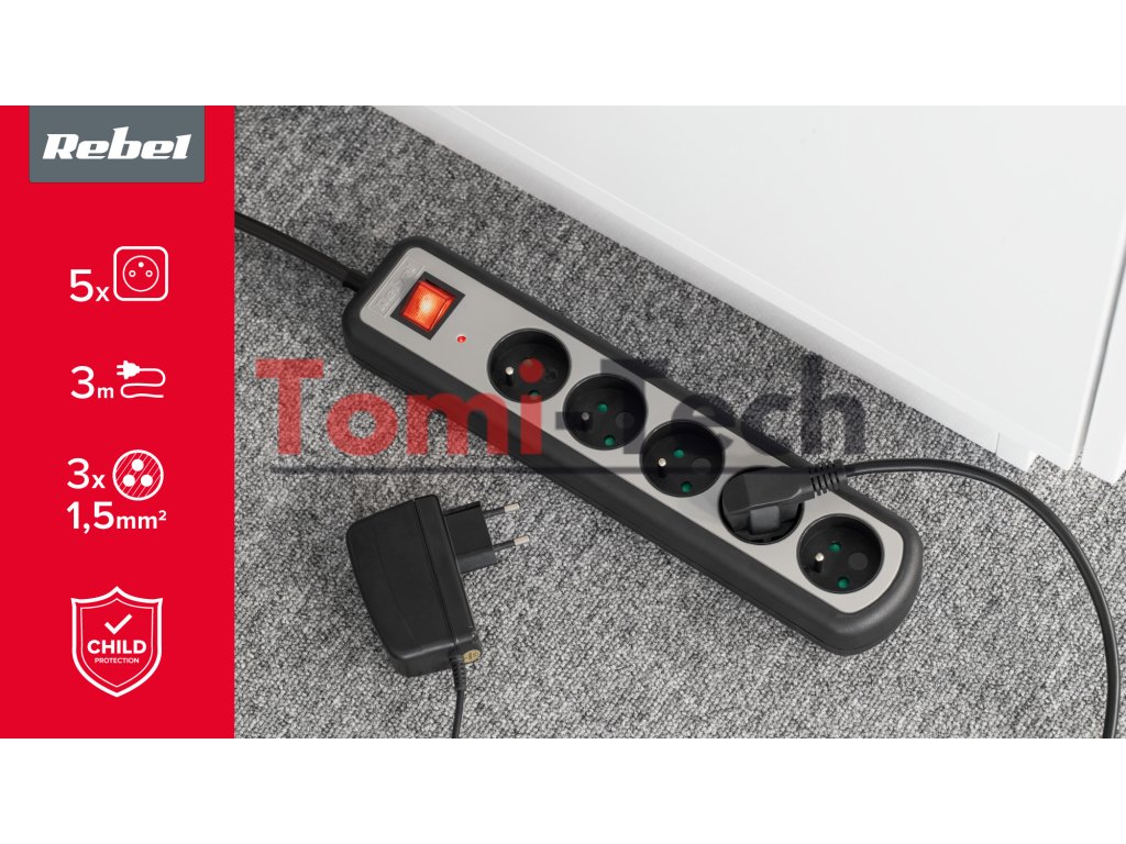 Rebel 5-zásuvkový predlžovací kábel s vypínačom, 3 m (3x1,5 mm)