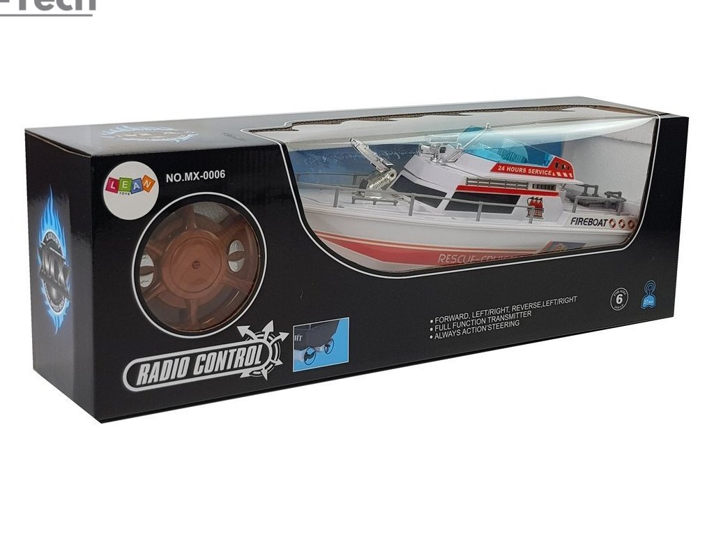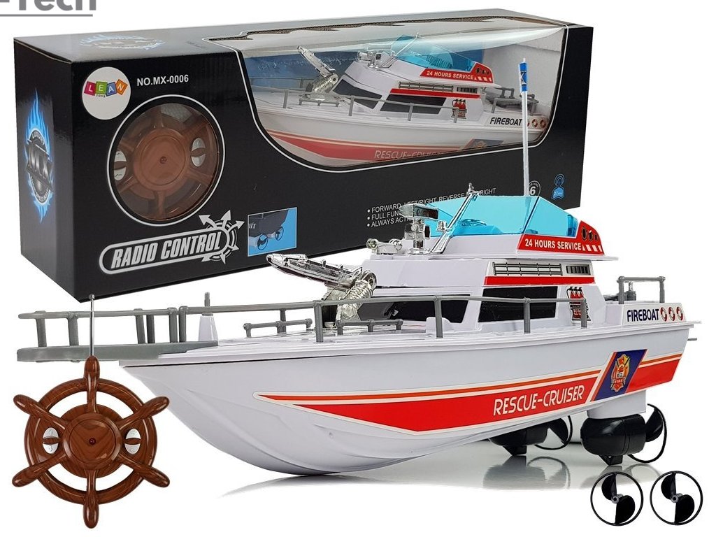 Záchranná jachta na diaľkové ovládanie má špeciálny dizajn, ktorý chráni pred vniknutím vody. Štartovacie tlačidlo sa nachádza na streche lode. Je určená pre záchranné operácie na mori a všetko je dokonale reprodukované v každom detaile. Má dva nezávislé motory, vďaka čomu je obratná, rýchla a spoľahlivá. Vysiela na frekvencii 27 MHz. Diaľkové ovládanie má tvar kormidla skutočnej lode. Môžete sa pohybovať dopredu, dozadu, doľava a doprava. Sada obsahuje aj anténu na zvýšenie dosahu.