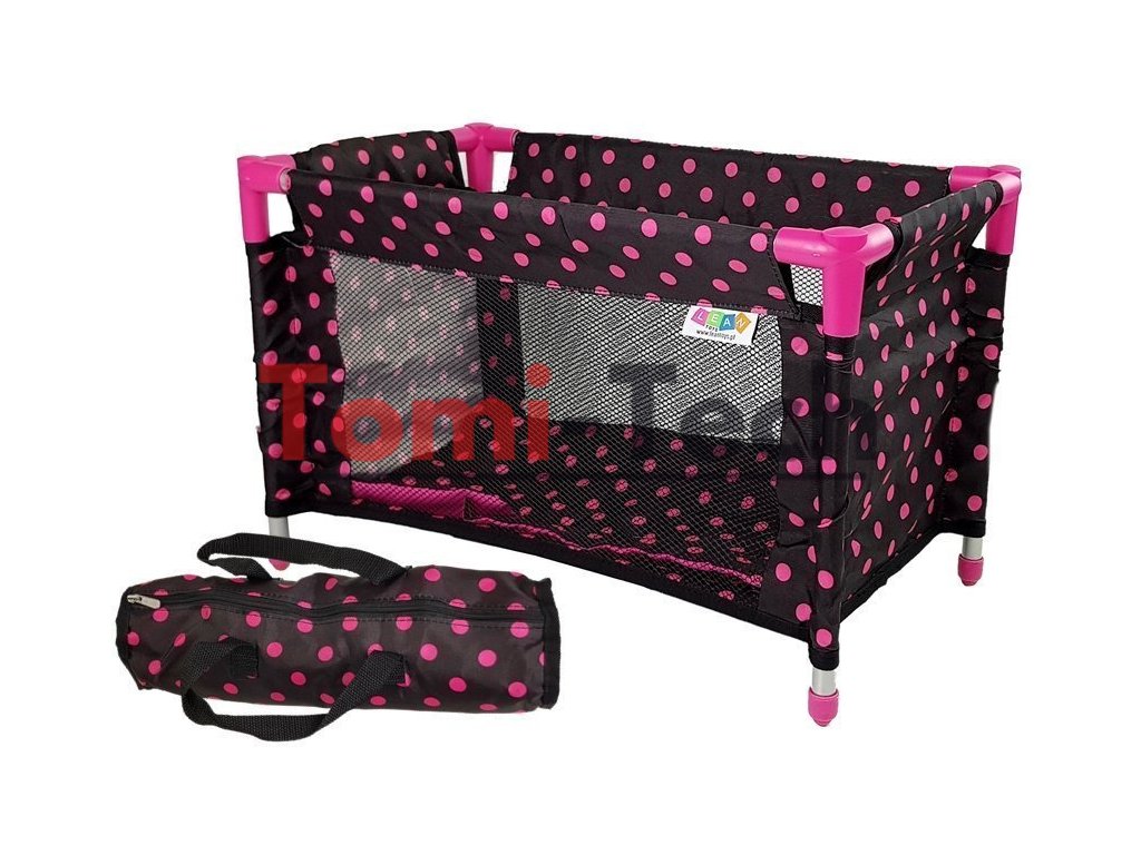 Teraz má bábika vášho drobčeka svoj vlastný kútik a miesto na spanie. Vďaka sieťovaným bokom postele môže pozorovať, čo sa s bábikou deje, a mať všetko pod kontrolou. Rám je vyrobený z hliníkových rúrok s ružovými plastovými spojmi. Sada obsahuje perinu a vankúš. Celá posteľ a jej komponenty sú čierne s ružovými bodkami. Dá sa ľahko rozobrať a uskladniť v prenosnej taške, takže si ju môžete vziať vždy so sebou. Dnutra sa zmestí bábika s veľkosťou približne 40 cm.