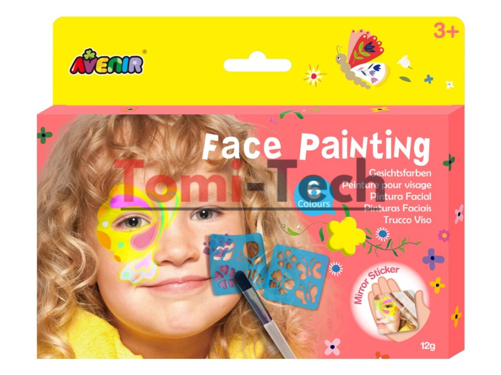 Sada na maľovanie na tvár Avenir je jednoduché riešenie pre deti, ktoré im umožňuje maľovať si tvár pomocou jednoduchých šablón. Táto zábavná sada obsahuje 6 nádherných farieb farieb na tvár spolu s dvoma opakovane použiteľnými šablónami na pomoc s kreslením, štetcom a nálepkou so zrkadlom. Je ideálna na párty a ako zábavná dekorácia. Táto sada na maľovanie na tvár určite zažije veľa. Súčasťou balenia je nálepka so zrkadlom, ktorá umožňuje úpravu selfie, vďaka čomu je to pre deti ešte zábavnejšie. Farby na tvár sú kozmetickej kvality (s certifikátom CPSR) a ľahko sa zmývajú mydlom a vodou, čo rodičom poskytuje bezproblémový zážitok. Táto sada je vhodná pre deti od 3 rokov a je ideálna pre malých umelcov, ktorí chcú vyjadriť svoju kreativitu.