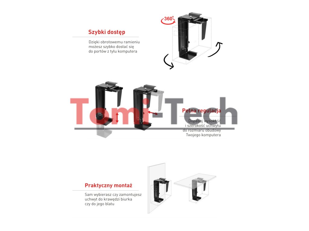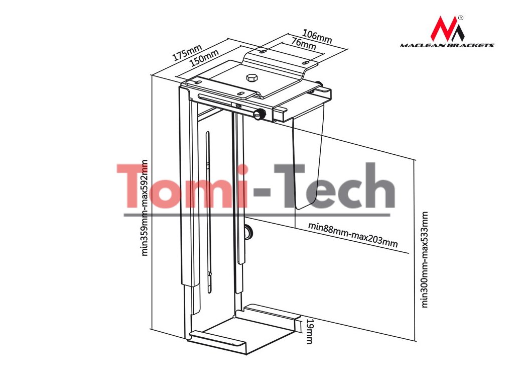 Držiak MC-713 je určený na vertikálnu montáž počítača pod stôl. Je to perfektné riešenie pre optimálne využitie vášho pracovného priestoru. Použitie držiaka MC-713 zväčšuje množstvo voľného miesta na stole a zároveň udržiava počítač mimo podlahy, mimo dosahu vašich nôh, prachu a statickej elektriny. A čo je najdôležitejšie, váš počítač je vždy na dosah ruky. Držiak MC-713 sa hodí do akéhokoľvek tvaru skrinky s maximálnou šírkou 203 mm.