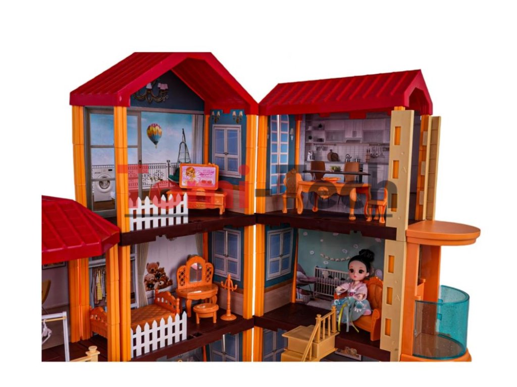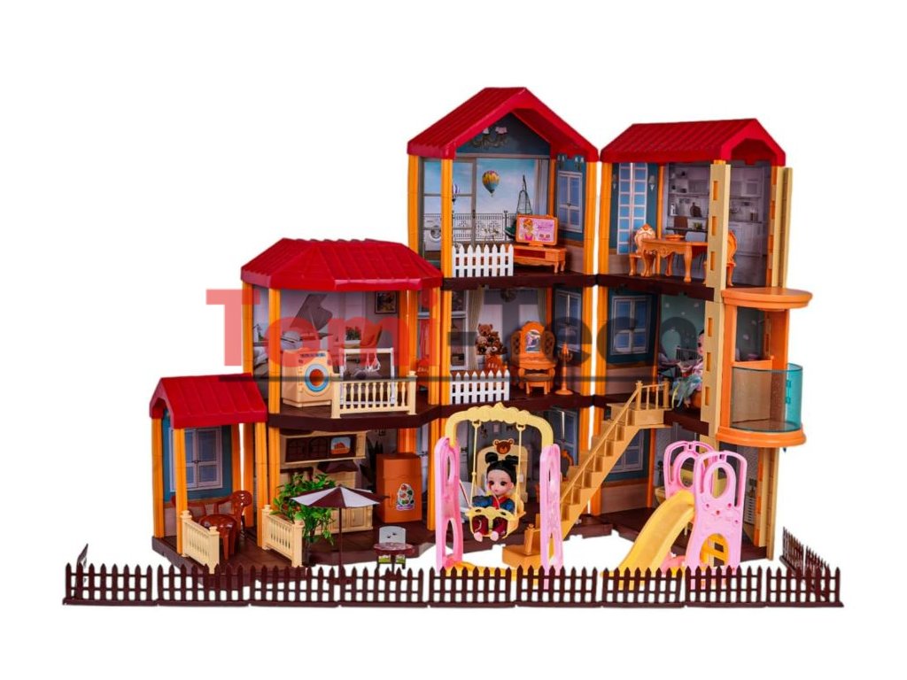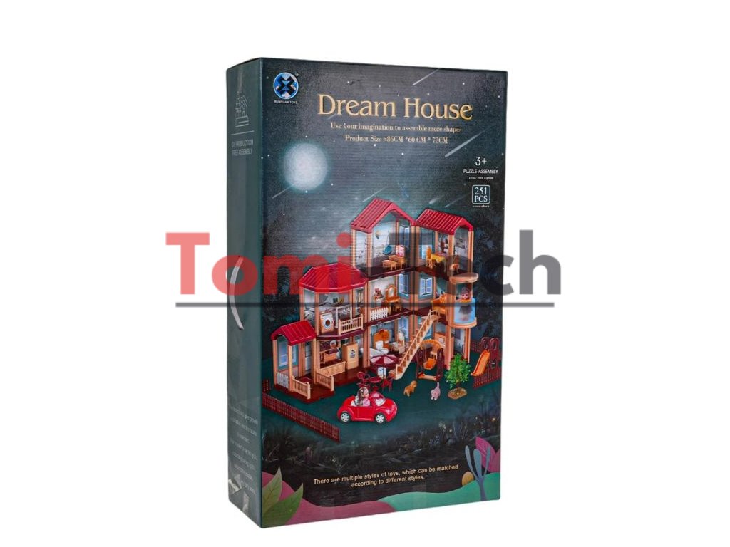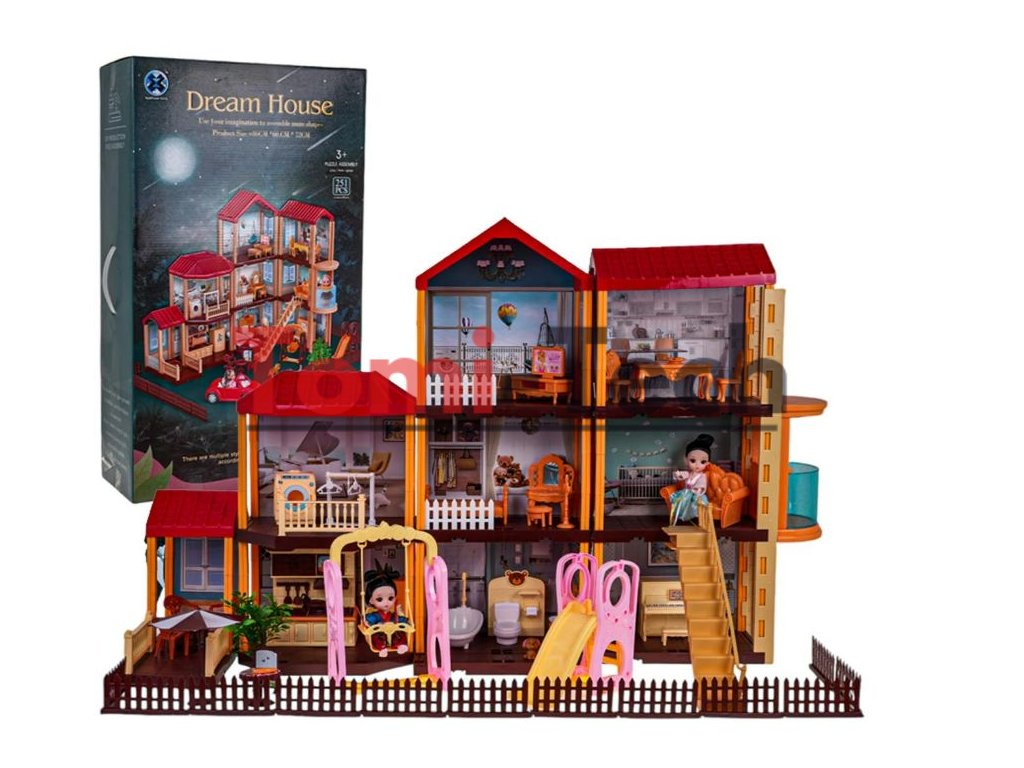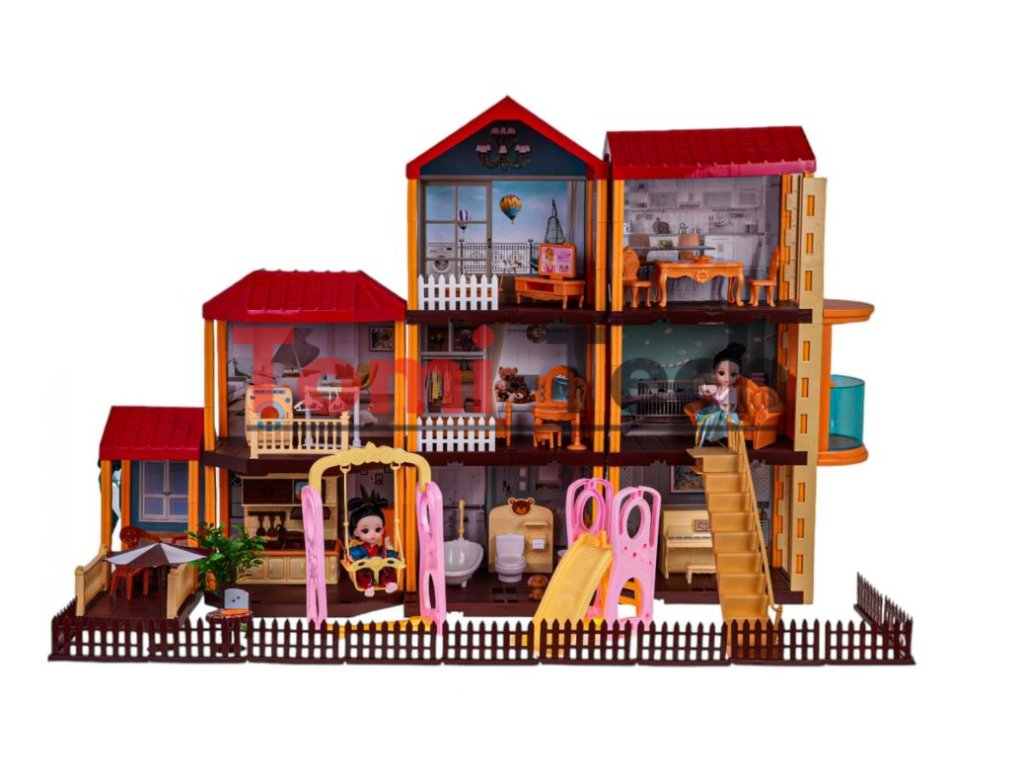Čarovný domček pre bábiky je určený pre deti od 3 rokov.Súprava obsahuje až 251 prvkov: domček, nábytok, auto, doplnky, dve bábiky ... Prvky súpravy sú vyrobené z najkvalitnejšieho plastu v živých farbách, ktoré upútajú pozornosť dieťaťa a podnecujú hru.V dome nájdete miestnosti ako: kuchyňa, kúpeľňa, hudobná miestnosť, obývačka, spálňa, šatňa, obývačka.Dom je oplotený, pred domom je detský kútik so šmýkačkou a hojdačkou a oddychová zóna so stolom, stoličkami a slnečníkom.Domček je vybavený osvetlením,sada obsahuje 5 svietidiel, napájané batériami AG13, spolu 15 kusov.