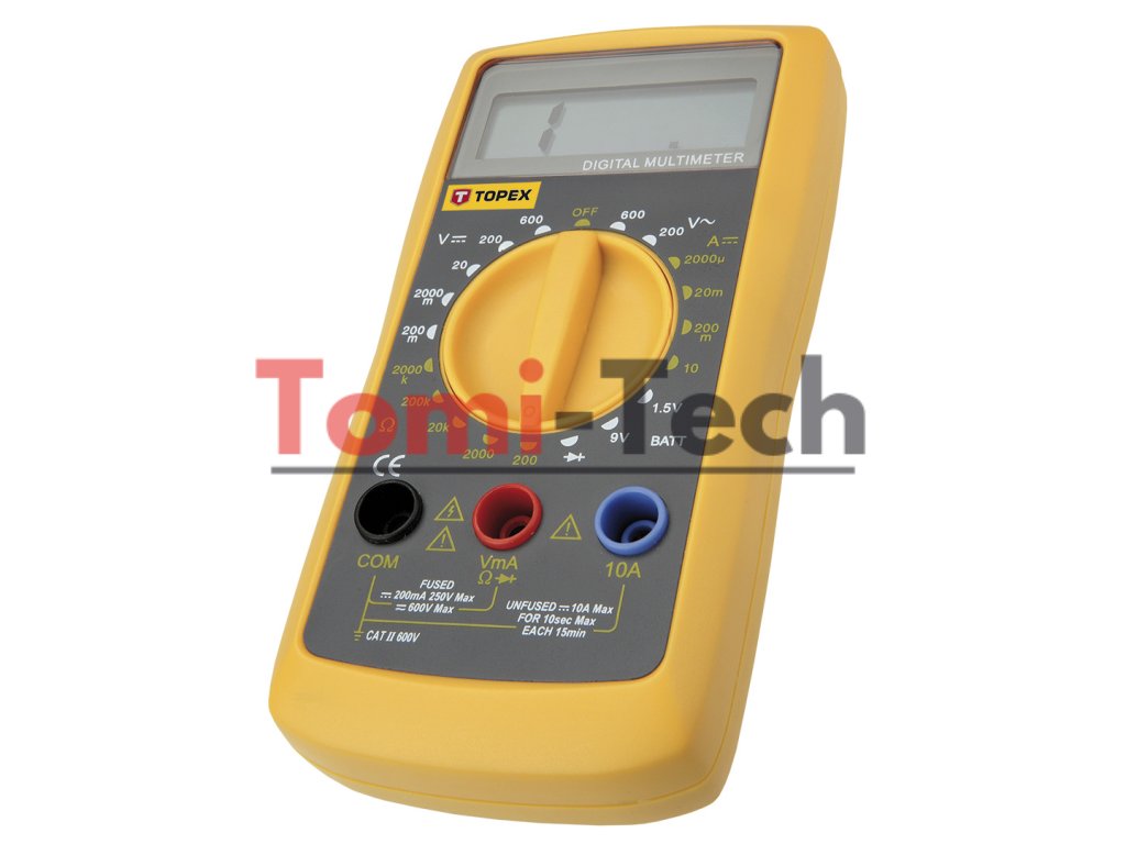 Univerzálny elektronický merač, meracie funkcie: striedavé napätie, jednosmerné napätie, hodnota jednosmerného prúdu, odpor, meranie diód, tester batérií 1,5 V, 9 V, CE, do 300 V, CAT IIIDodatočné parametre