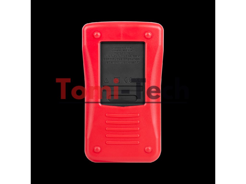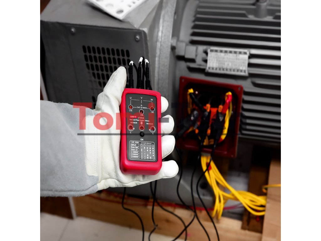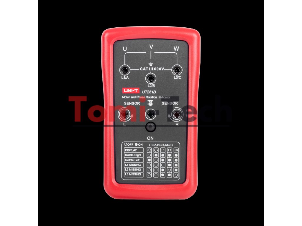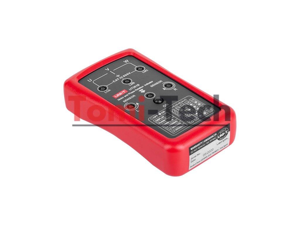 UT261B umožňuje presnú detekciu sledu fáz pomocou LED indikácie, čo uľahčuje identifikáciu správneho sledu fáz v trojfázových systémoch. Funkcia detekcie chýbajúcej fázy je tiež vizualizovaná pomocou LED diód, čo umožňuje rýchlu lokalizáciu problémových oblastí. Okrem toho môže merač indikovať otáčky motora, čo je dôležité pre uvedenie do prevádzky alebo diagnostiku stroja.