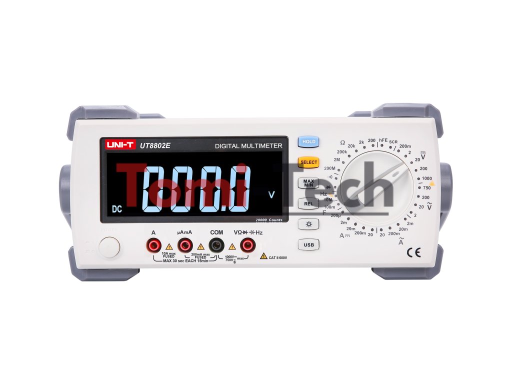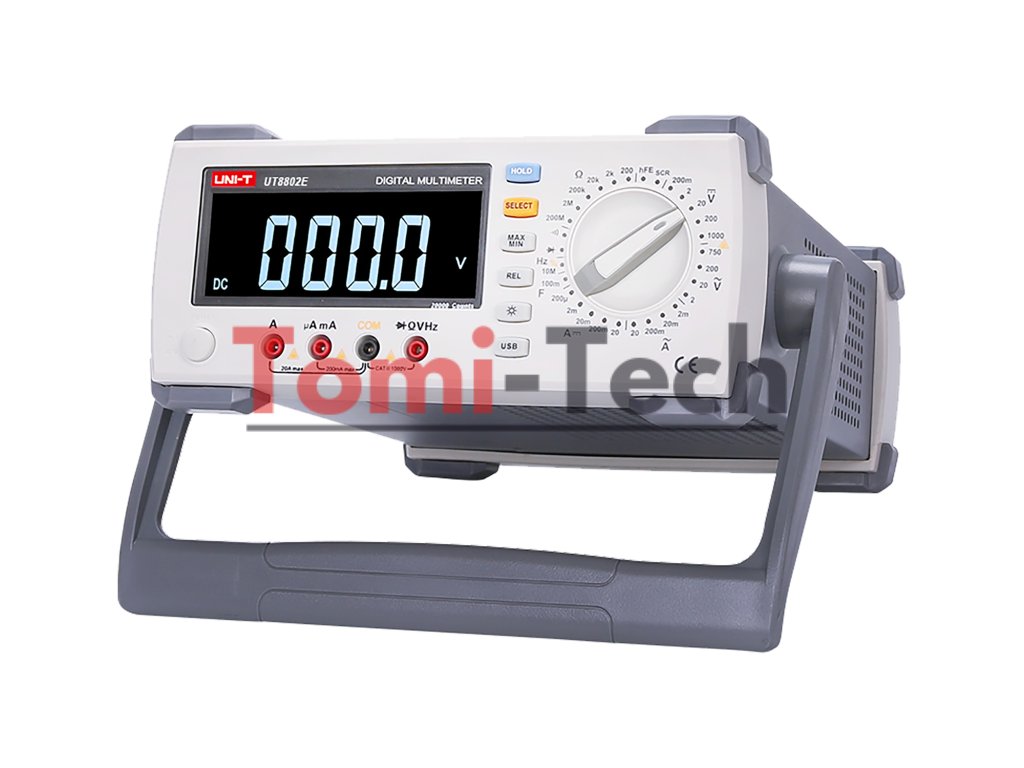 UT8802E ponúka široký rozsah merania jednosmerného napätia od 200 mV až 1000 V s vysokou presnosťou Ω (0,1 % + 3). Prístroj meria aj striedavé napätie (AC) až do 750 V s presnosťou Ω (0,5 % + 20). Merač podporuje meranie jednosmerného a striedavého prúdu do 20 A, odporu do 200 MΩ a kapacity do 100 mF, vďaka čomu je všestranným nástrojom na analýzu rôznych elektrických systémov.
