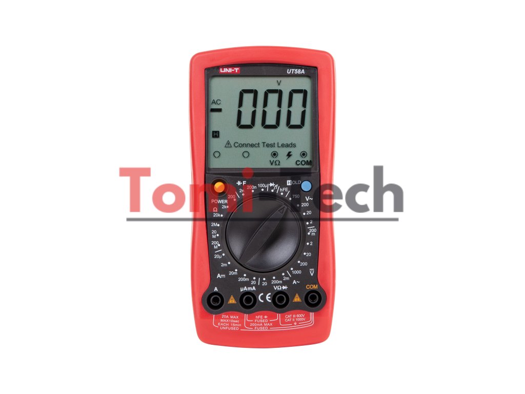 UT58A presné meranie jednosmerného napätia do 1000 V a striedavého napätia do 750 V. Prístroj meria aj jednosmerný prúd do 20 A a širokým distančným prostriedkom, ktorý je odolný až do MO až 2hm prúdu 100 Ω, čo znamená, že sa dá nastaviť Funguje ako test diódy, kontrola zapojenia a chodu tranzistora hFE ďalej rozširujú možnosti použitia meracieho prístroja.