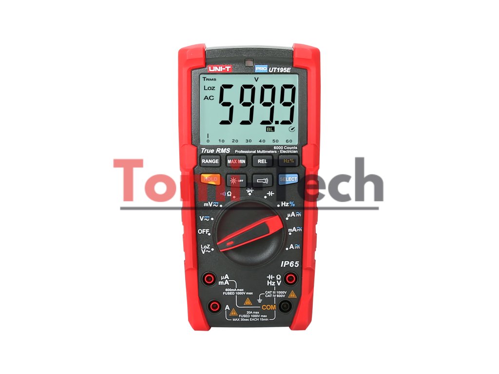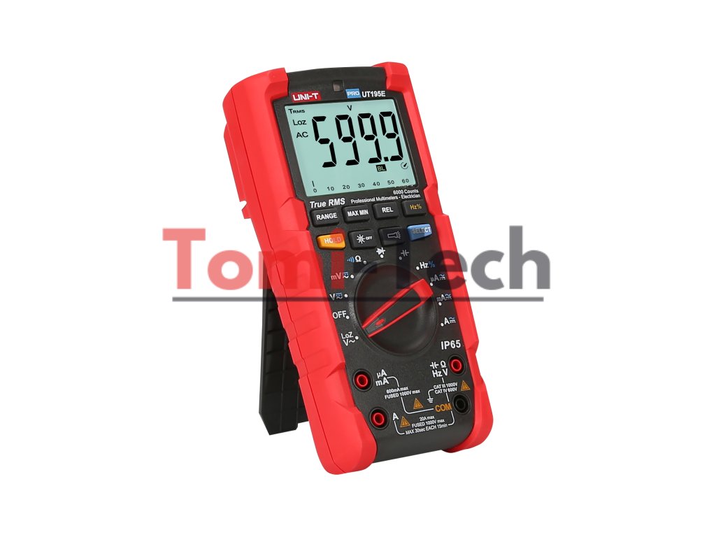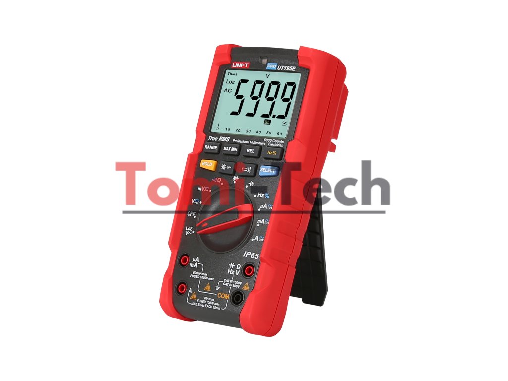 Uni-T PRO UT195E je vybavený automatickým a manuálnym nastavovaním rozsahu, ako aj meraním skutočnej RMS hodnoty, čo zaisťuje presné výsledky pre nepravidelné signály. Funkcie zariadenia rozširujú ďalšie funkcie, ako napríklad meranie striedavého napätia pre zdroje s nízkou vnútornou impedanciou (LoZ), režim relatívneho merania, záznam MAX/MIN a uloženie poslednej hodnoty. 31-segmentový analógový stĺpcový graf umožňuje rýchle vyhodnotenie hodnôt, zatiaľ čo automatické podsvietenie LCD displeja a svietidlo zaisťujú pohodlnú prácu v zlých svetelných podmienkach.