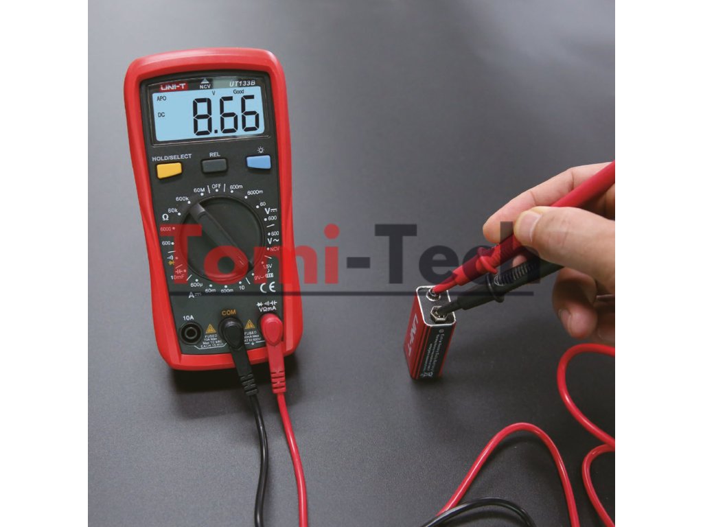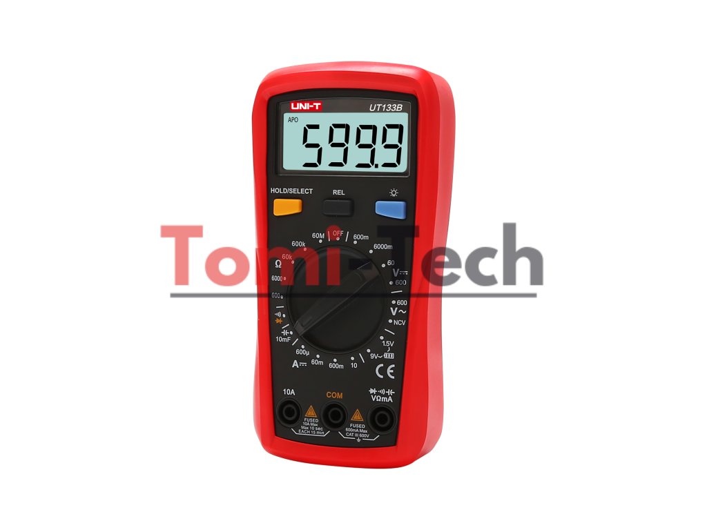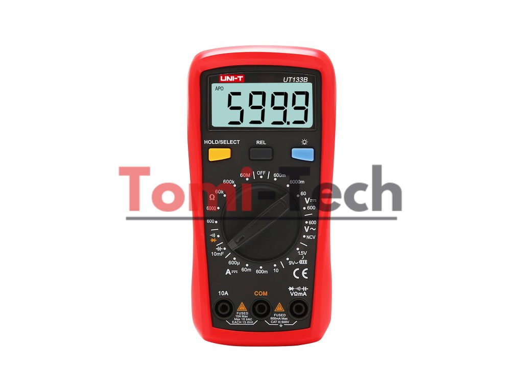 UT133B ponúka širokú škálu meracích možností vrátane merania jednosmerného napätia (DC) do 600 V s presnosťou Ω (0,5 % + 2) a striedavé napätie (AC) do 600 V s presnosťou Ω (1,2 % + 3). Prístroj meria aj jednosmerný prúd (DC) do 10 A a odpor do 60 MOhm, vďaka čomu je vhodný na použitie s rôznymi elektrickými obvodmi. Okrem toho merač ponúka funkciu merania kapacity do 9,999 mF a testovanie batérií 1,5 V a 9 V. Funkcie testu diód a testu kontinuity zvyšujú všestrannosť zariadenia.