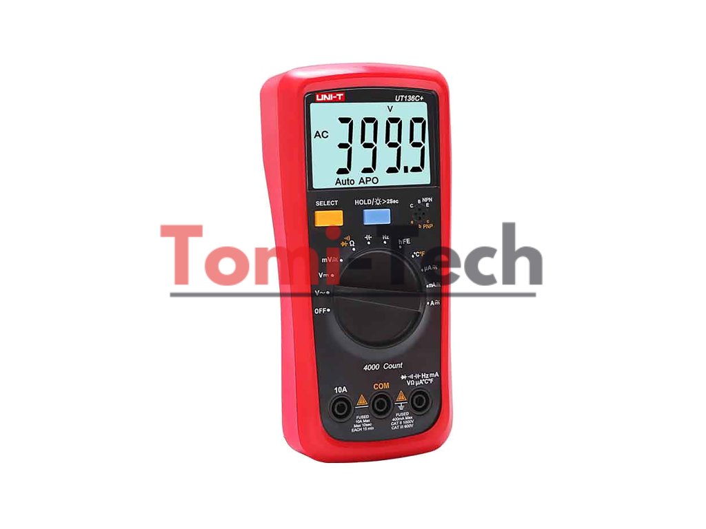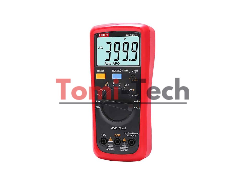 UT136C+ meria jednosmerné (DC) a striedavé (AC) napätie až do 1000 V, čo mu umožňuje pracovať s rôznymi typmi elektrických inštalácií. Prístroj ponúka aj meranie prúdu do 10 A a meranie odporu do 40 MOhm, vďaka čomu je všestranným diagnostickým nástrojom. Okrem toho merač umožňuje meranie teploty v širokom rozsahu od -40 °C do 1000 °C a od -40 °F do 1832 °F, čo zvyšuje jeho funkčnosť. Funkcie testu diód, kontroly kontinuity a merania hFE tranzistorov dopĺňajú bohatú sadu možností.
