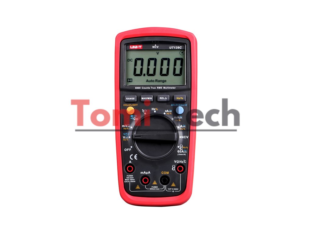 UT139C poskytuje široký rozsah merania, Pokrýva napätie do 600 V, prúdy do 10 A, odpor do 60 MΩ, kapacitu do 99,99 mF a frekvencie do 9,999 MHz. Presné údaje sú zaručené nízkymi chybami merania, ako napríklad Ω(0,5 % + 2) pre jednosmerné napätie.