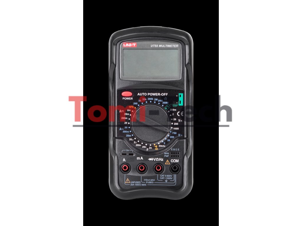 UT55 ponúka presné merania jednosmerného napätia až do 1000 V a striedavého napätia do 750 V, ako aj jednosmerný a striedavý prúd do 20 A. Okrem toho dokáže merač merať odpor, kapacitu, frekvenciu a teplotu v rozsahu od -20 °C do 1000 °C. Funkcie ako test diód, meranie HFE tranzistorov a kontrola kontinuity robia z UT55 univerzálny nástroj pre rôzne aplikácie.