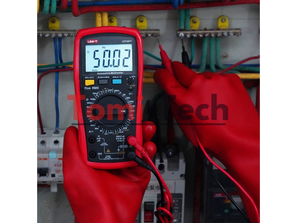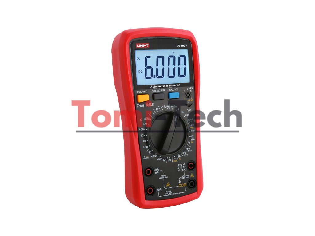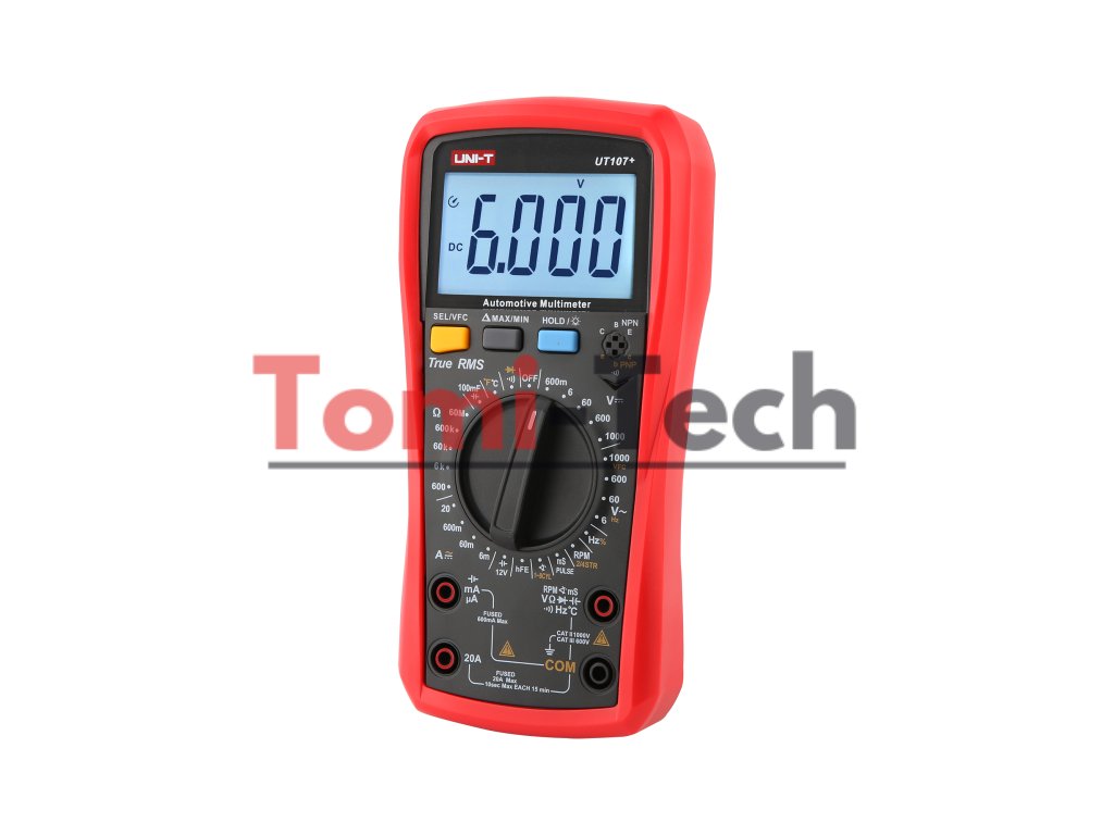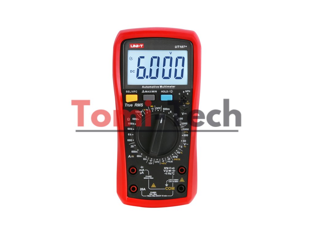 Merač UNI-T UT107+ ponúka presné meranie napätia až do 1000 V, prúdu do 10 A, odpor do 60 MΩ a kapacita do 100 mF. Podporuje tiež merania frekvencie do 10 MHz a merania teploty v rozsahu od -40 °C do 1000 °C. Test diód, test kontinuity, pracovný cyklus, meranie hFE tranzistorov a test 12 V batérie robia z UT107+ kompletný diagnostický nástroj.