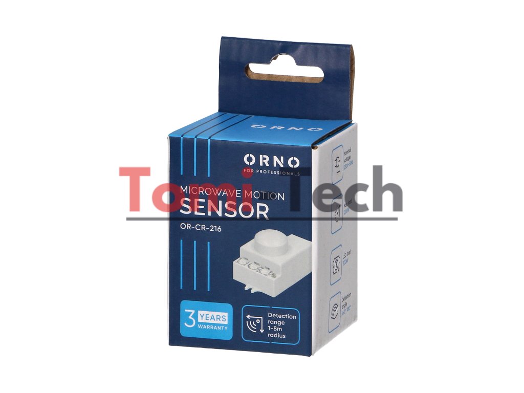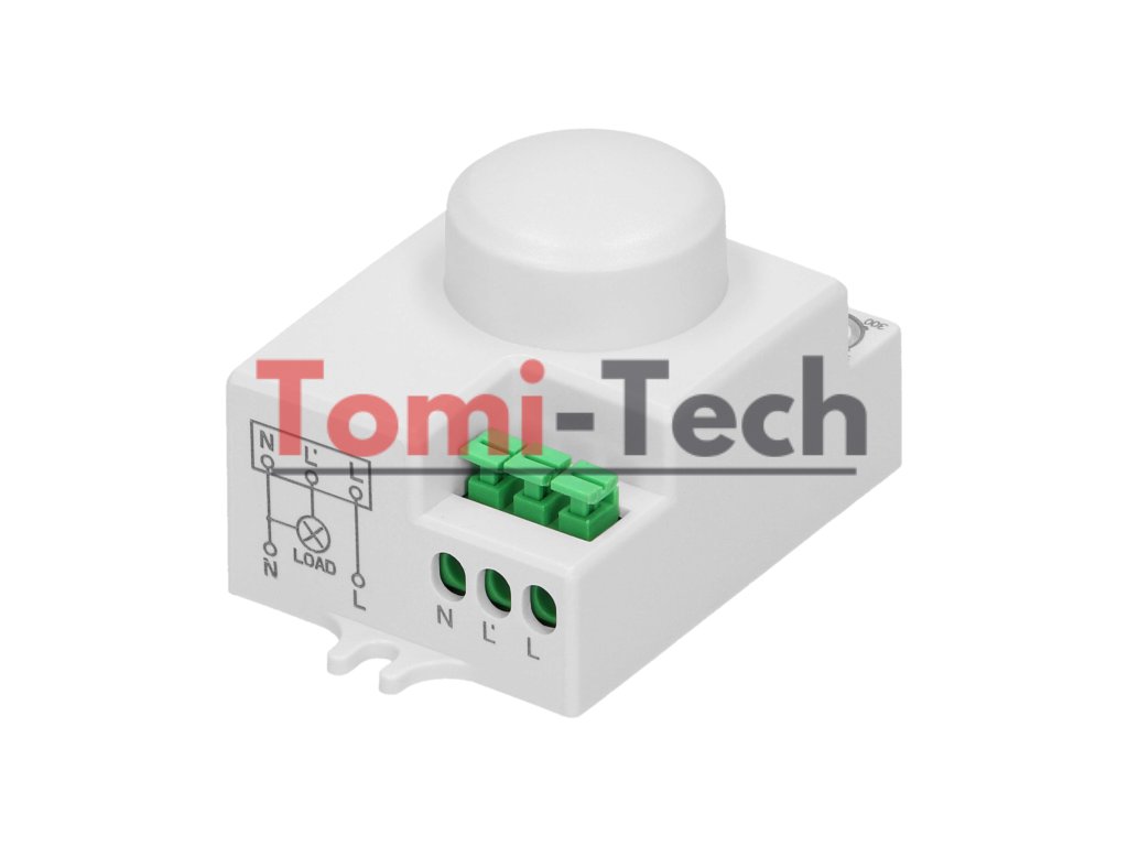 Tento kompaktný mikrovlnný (radarový) snímač pohybu je aktívny detektor pohybu, ktorý vysiela vysokofrekvenčné elektromagnetické vlny (5,8 GHz) a prijíma ich ozvenu. Snímač detekuje zmeny v ozve spôsobené aj najmenším pohybom v monitorovanej oblasti. Má nízku spotrebu energie (<0,2 mW) a potenciometre nastavujú trvanie svetla, dosah detekcie pohybu a citlivosť intenzity svetla. Detekcia pohybu cez sklo, plast a sadrokartón nie je ovplyvnená teplotou. Snímač je kompatibilný s LED osvetlením.Dodatočné parametre