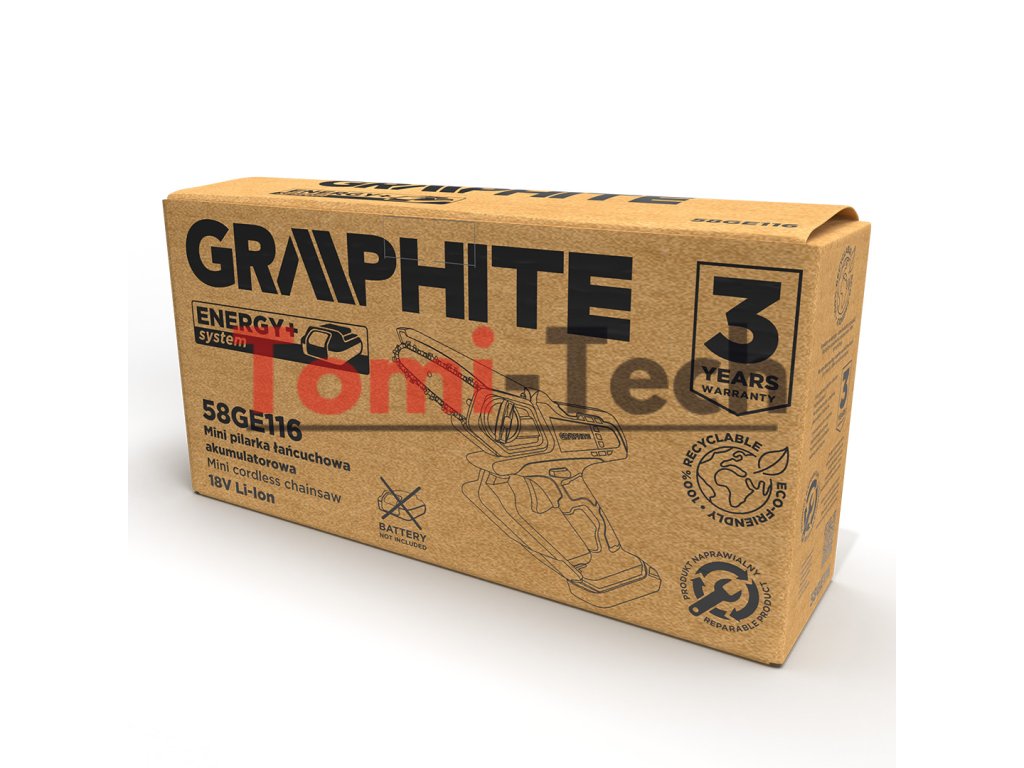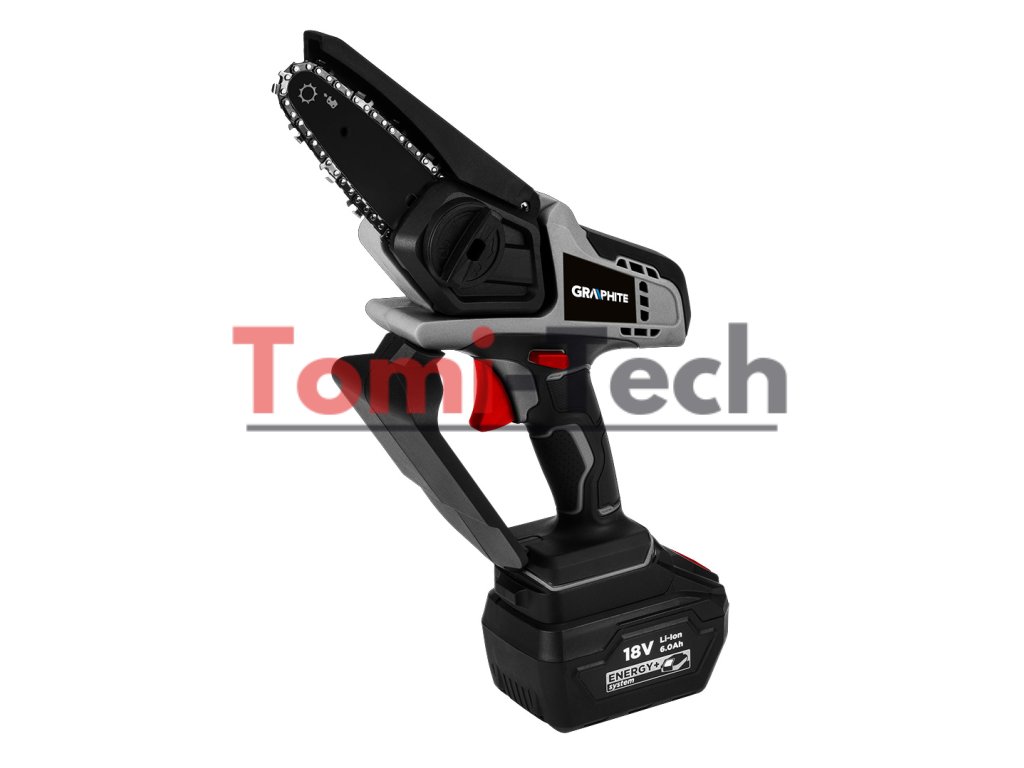 Akumulátorová mini reťazová píla Energy+ 18 V, lineárna rýchlosť reťaze 4,6 m/s, vodiaca lišta 5/130 mm, rozsah rezania 4"/100 mm, hrúbka reťaze 1,1 mm (špecifikácia: rozstup: 0,3"/7,62 mm, počet článkov: 23), hmotnosť 1,25 kg, prevádzková doba 2/4/6 Ah 45/90/180 minDodatočné parametre
