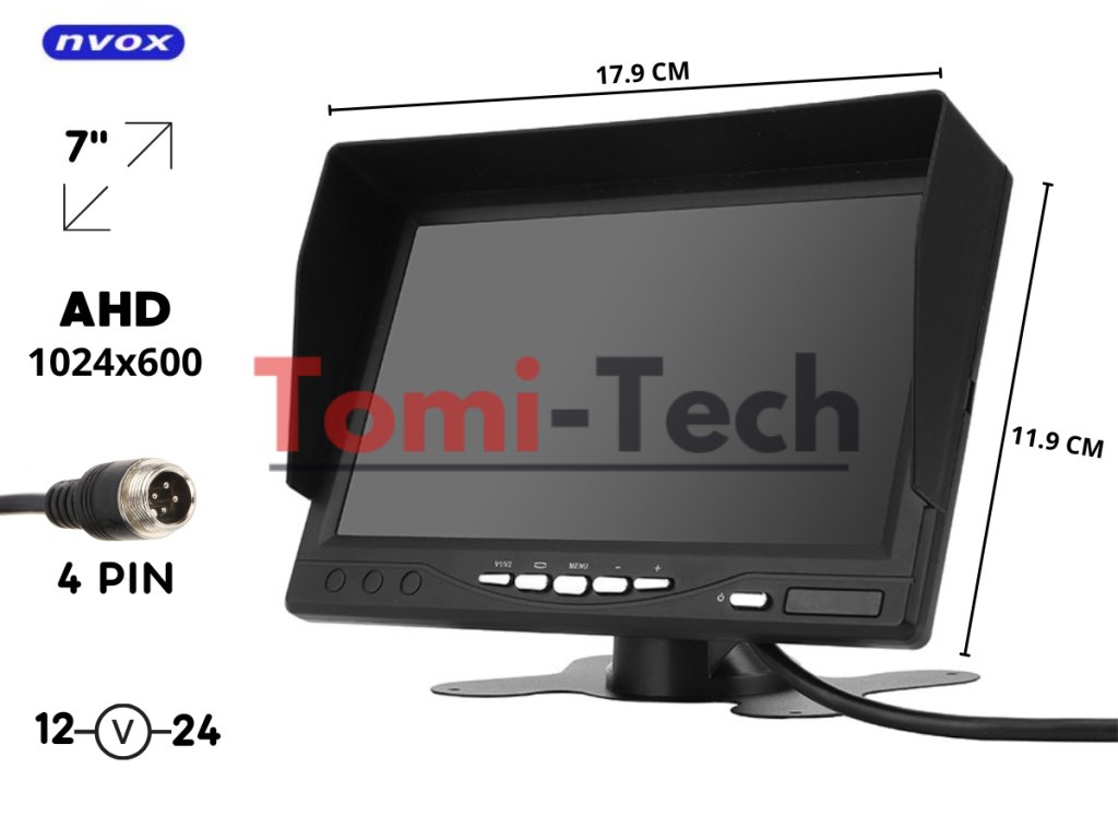 7-palcový LCD monitor do auta pre 2 kamery, AHD, 4pin, 12V/24V