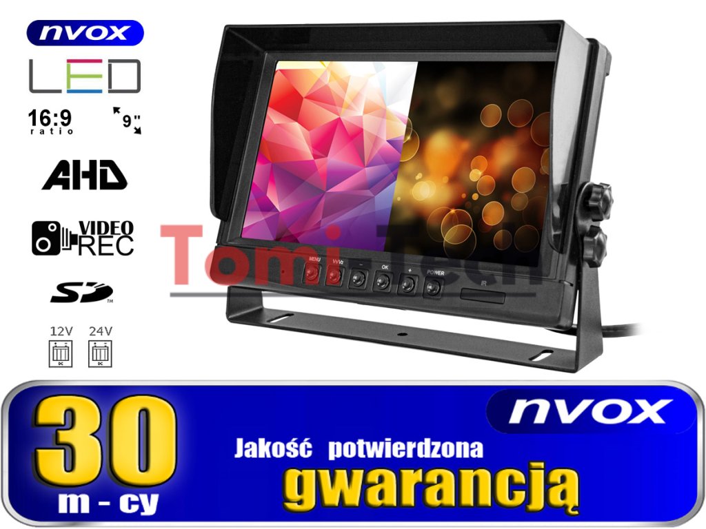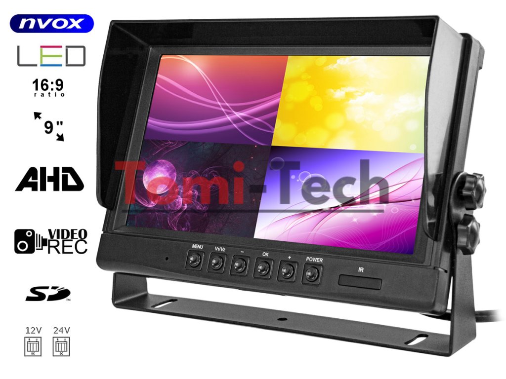 9-palcový LCD monitor do auta, AHD, 4pinový, s funkciou nahrávania, 12V/24V