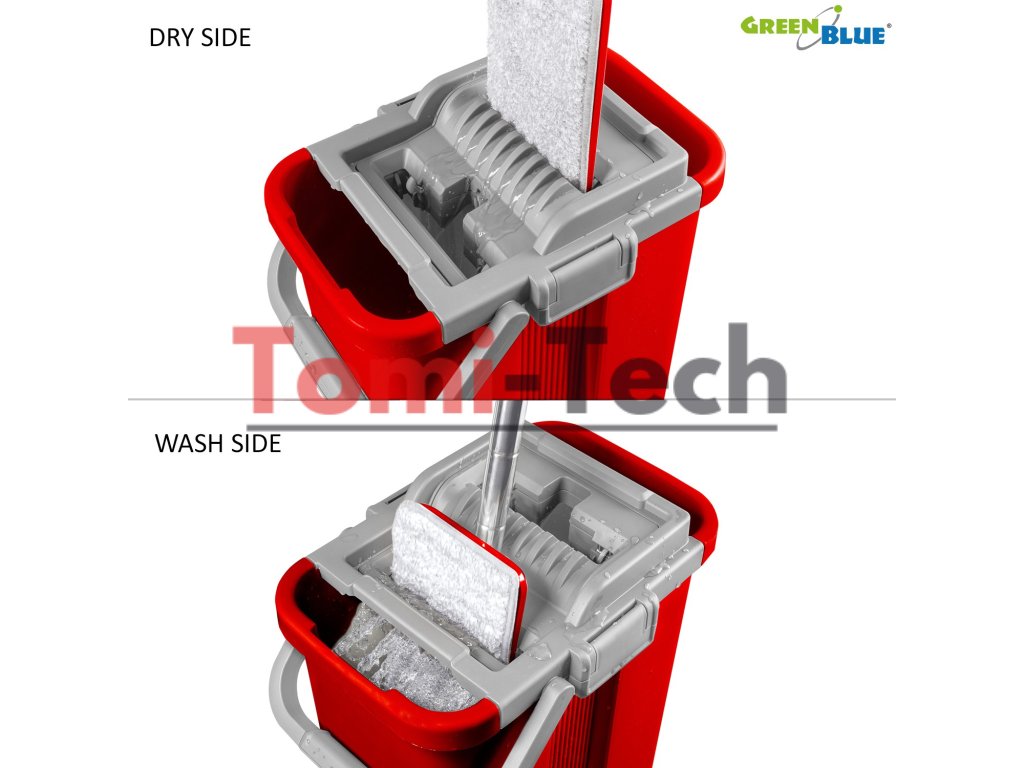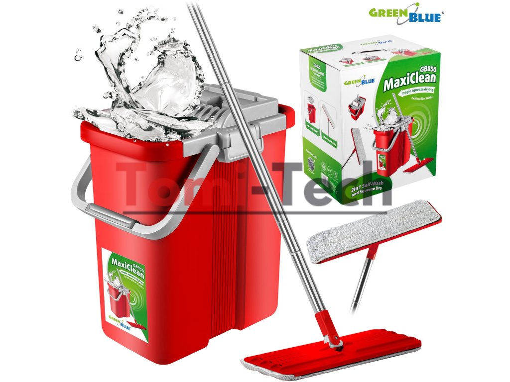 Sada obsahuje- Plochý mop GreenBlue MaxiClean GB850 s vedrom a žmýkačom
