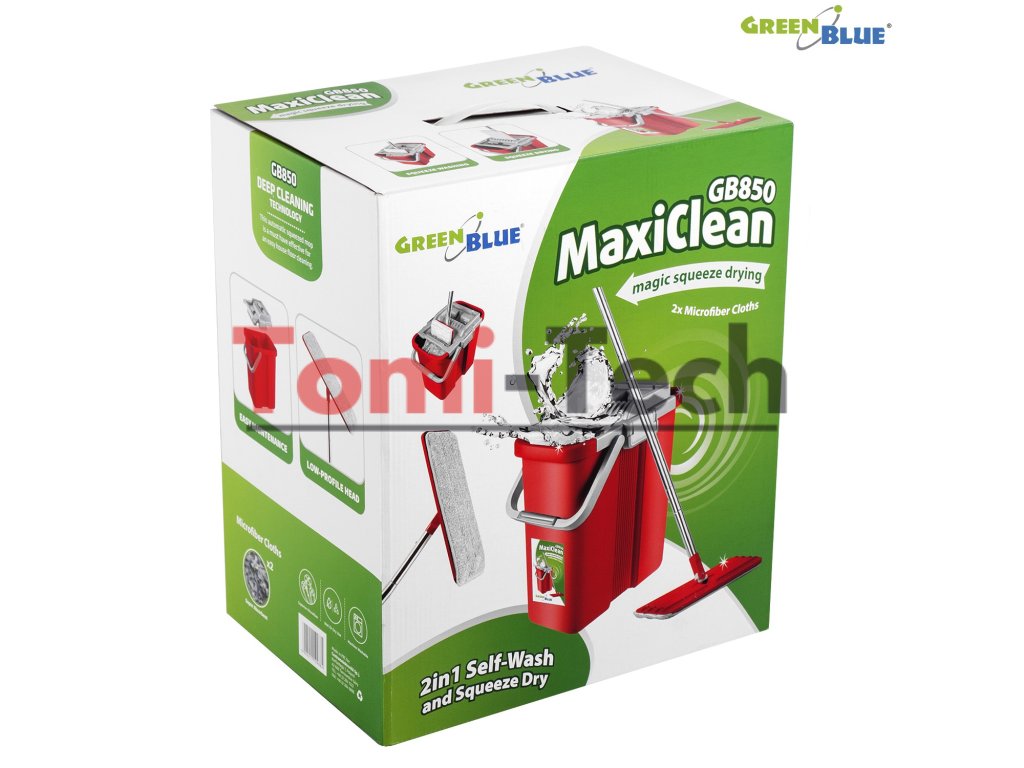Sada obsahuje- GreenBlue MaxiClean GB850 plochý mop s vedrom a žmýkačkou
