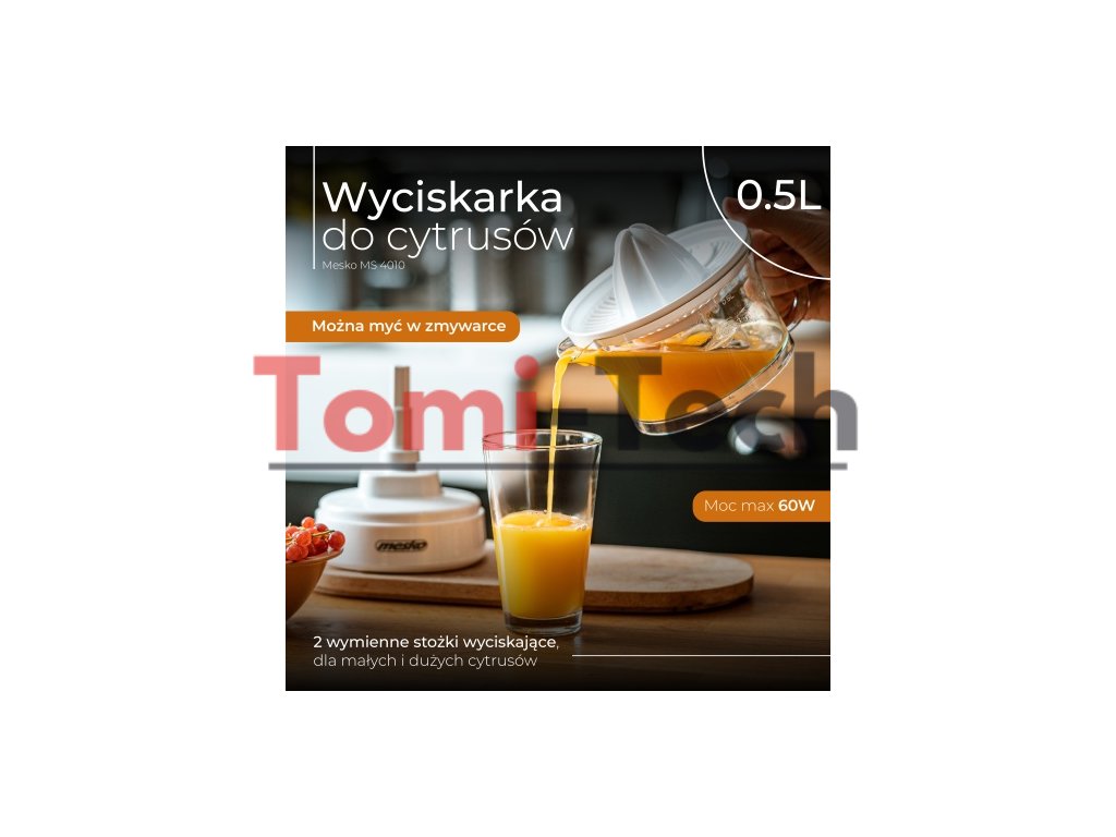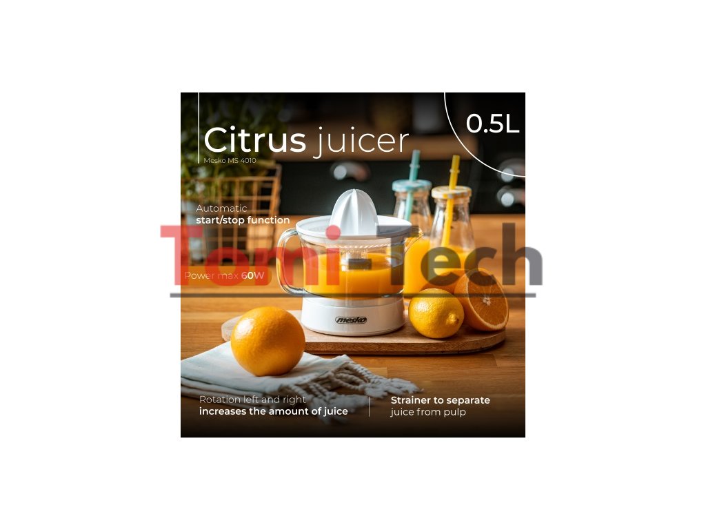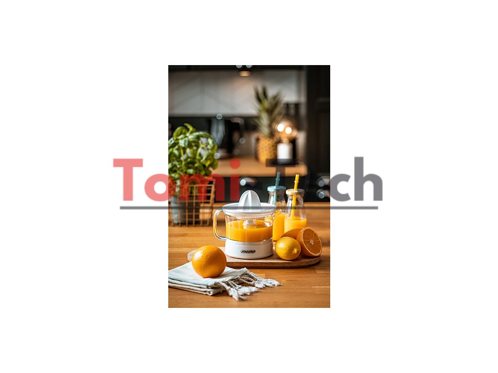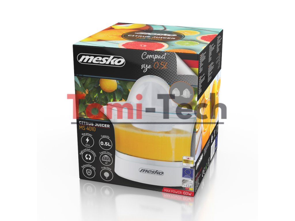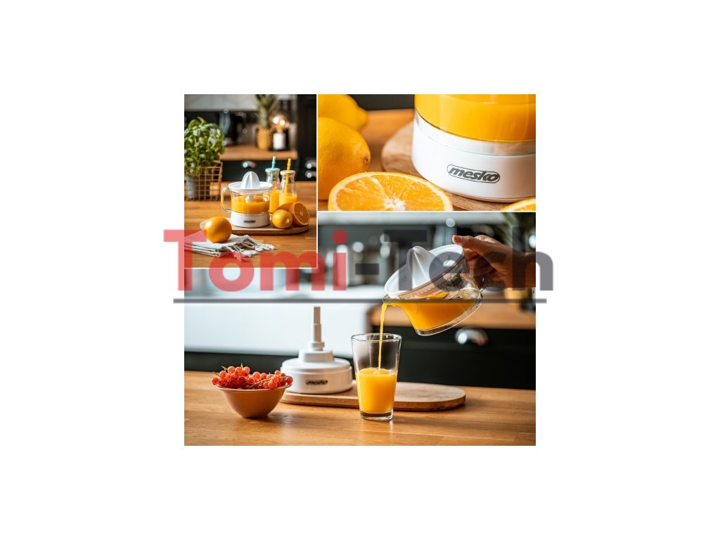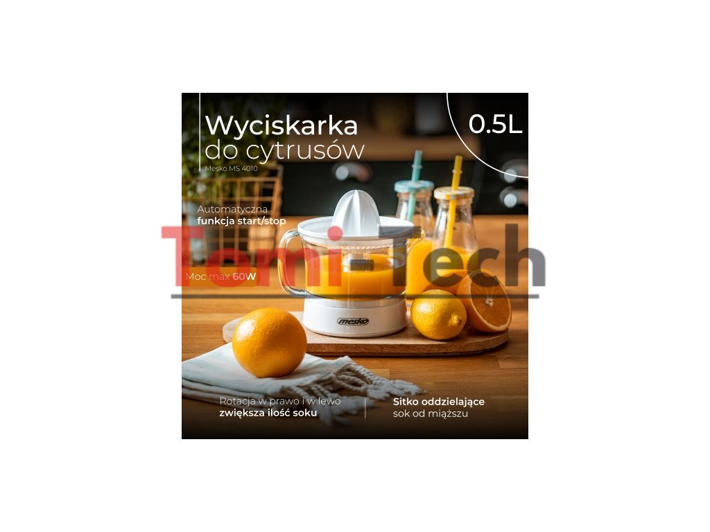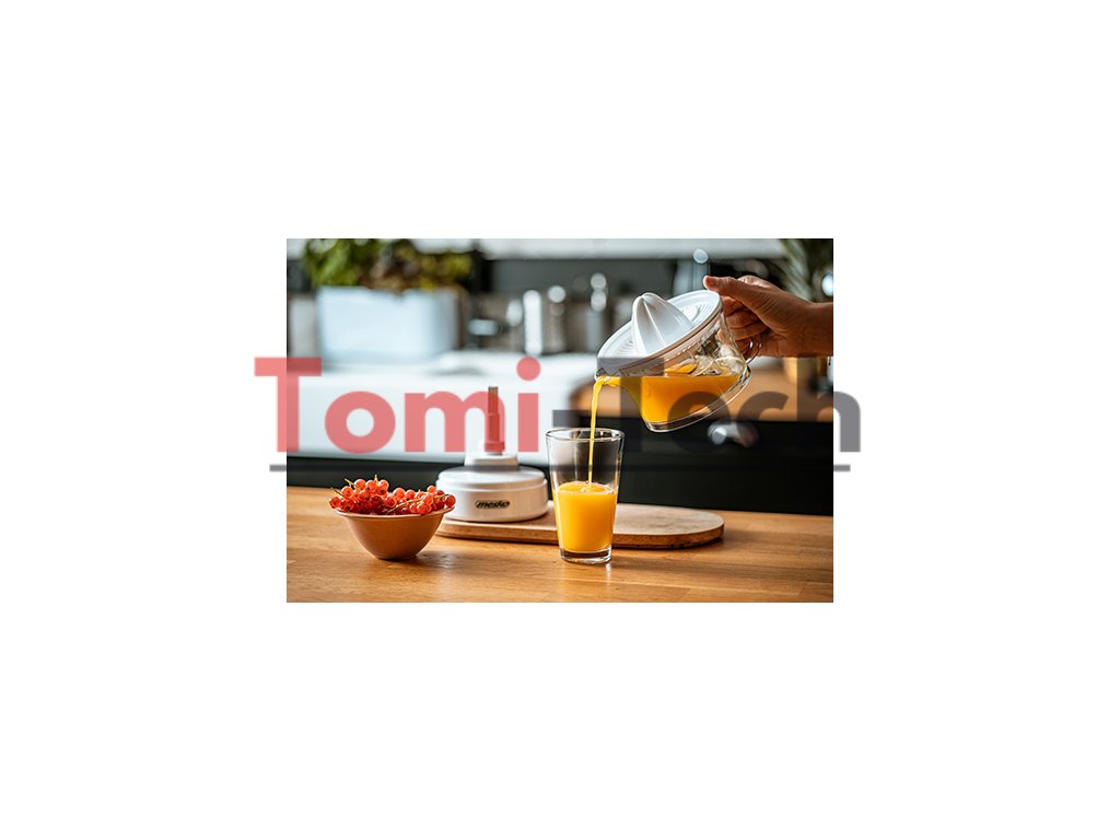 Esteticky príjemný odšťavovač na citrusy s výkonom 40 W. Umožňuje vám efektívne pripraviť čerstvú šťavu z citrónov, pomarančov a grapefruitov. Sitko umiestnené na nádobe zachytáva dužinu a jadierka, čím zabraňuje ich vniknutiu do šťavy. Vďaka obojstrannej rotácii sa ovocie vytlačí do poslednej kvapky. Pohodlie používania zaisťuje automatické spustenie pri použití tlaku a automatické vypnutie po vybratí ovocia. Ochranný kryt zabraňuje rozstrekovaniu šťavy na stôl alebo kuchynskú linku. Odšťavovač MS 4010 má nádobu s objemom 0,5 l, čo vám umožňuje pripraviť šťavu pre dve osoby. Kľúčovou výhodou odšťavovača je jeho veľkosť, ktorá uľahčuje skladovanie. Okrem motorovej jednotky sú všetky ostatné plastové časti vhodné do umývačky riadu.