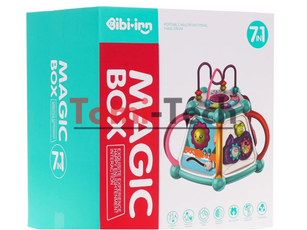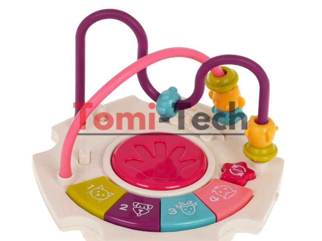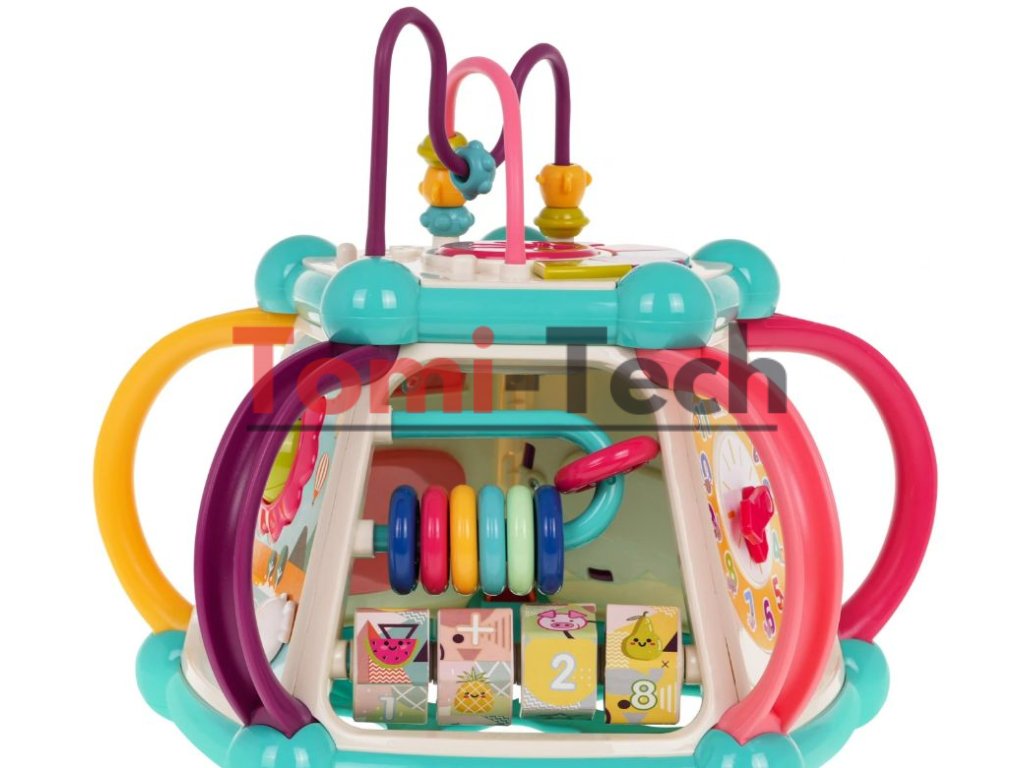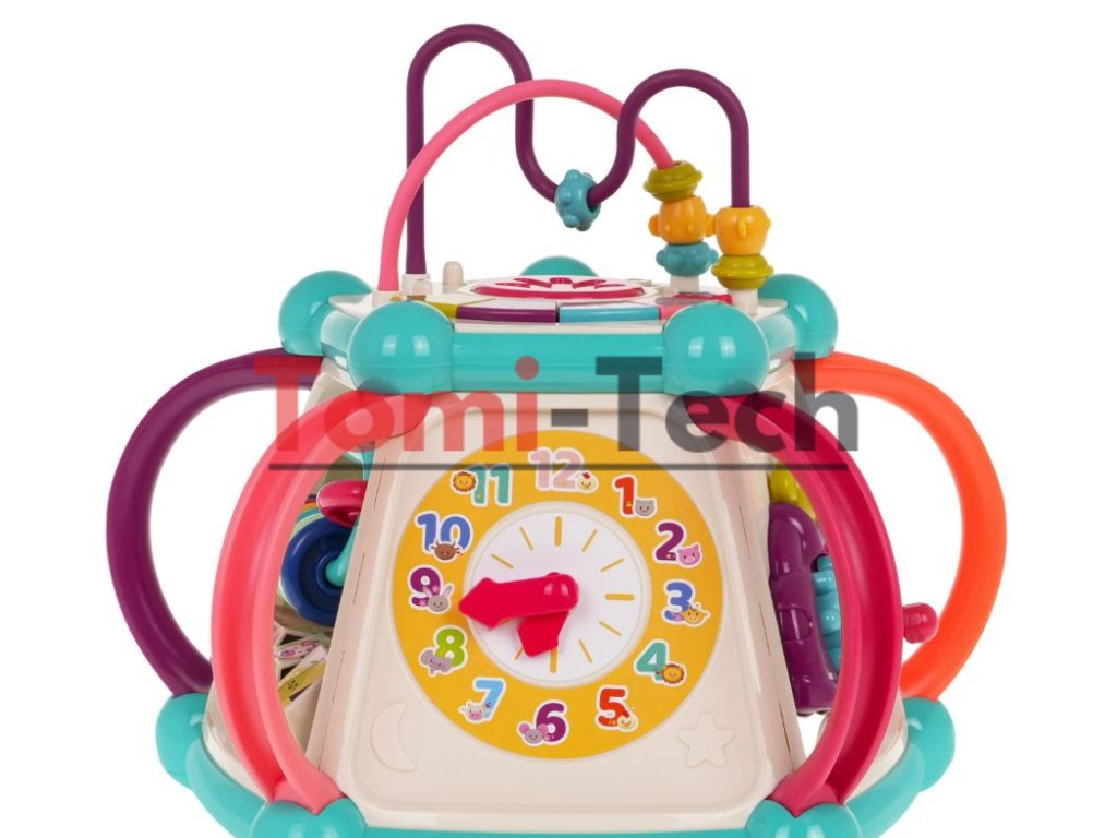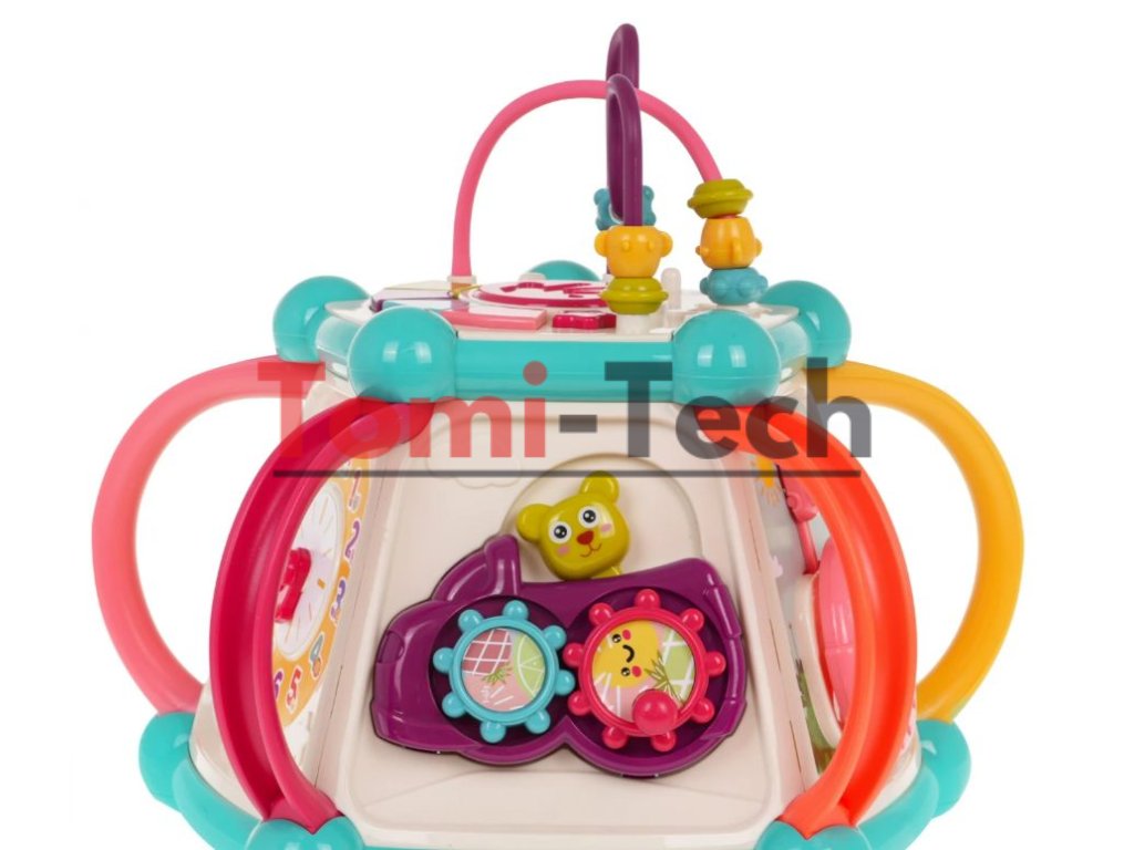 Vlastnosti hračky:vhodné pre deti od 6 mesiacov,vyrobené z bezpečných materiálov najvyššej kvality, množstvo farieb podporuje zábavu a učenie,každá stena skrýva iné tajomstvá,zvukové efekty: zvuky zvierat, hudba, bubon, zvuky rotujúceho náradia, hrkotanie na slnku, hrkotanie pri pohybe ryby,svetelné efekty: bubon, osvetlené klávesy,pohyblivé prvky: korálky na vrstve, slnko, ryba, korálky na počítadle, otočné bloky, hodinové ručičky, prevody s medvedíkom, volant s autom,sendviče,veľa príležitostí na zábavu,triedič blokov,učenie hrou.
