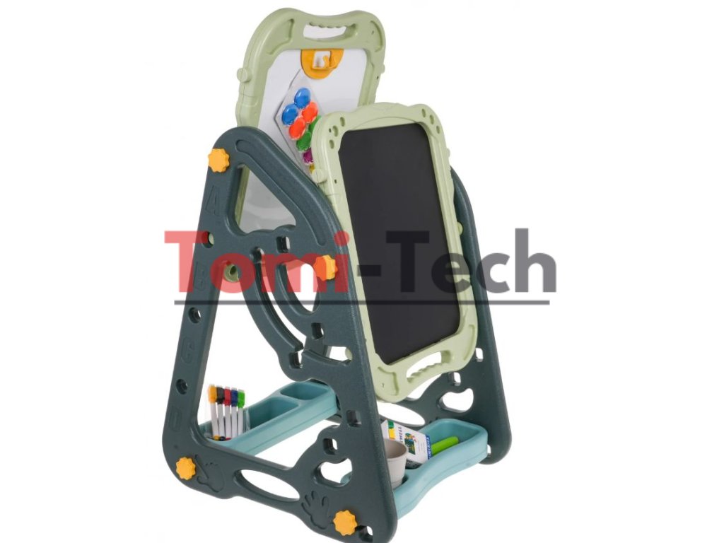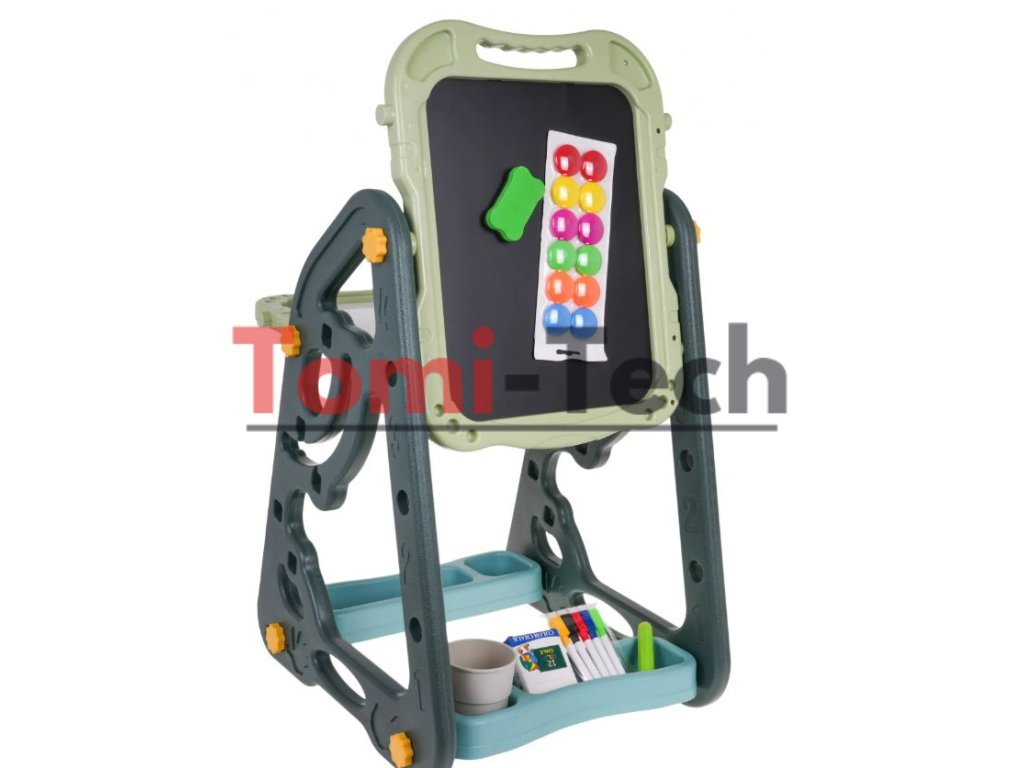 Obojstranná tabuľa: jedna strana magnetická, druhá kriedová. Výšku tabúľ je možné regulovať.Stôl s tabuľou: Písanie fixami alebo pripojenie farebných magnetov na bielu stranu, a kreslenie kriedou na čiernu stranu.
