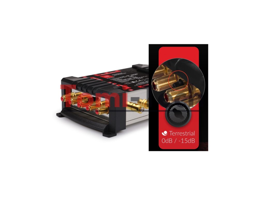 Multiprepínač OPTICUM OMS 5/8 PRO TRQ PLATINUM je určený pre satelitné anténne systémy DVB-S2 a pozemné anténne systémy DVB-T2. Pozlátené zásuvky výrazne znižujú stratu signálu na pripojení anténneho kábla a zabraňujú oxidácii. Multiprepínač automaticky rozpozná typ signálu prenášaného do tunerov. Inštalácia by mala zahŕňať pripojenie multiprepínača k satelitnej parabole s priemerom najmenej 0,8 m, Quattro alebo Quad LNB a pozemnej anténe. Satelitné a pozemné signály prichádzajúce z multiprepínača sú oddelené pomocou zásuviek pre koncových používateľov. Multiprepínač je napájaný externým zdrojom napájania, čo eliminuje jav zvýšenej prevádzkovej teploty, ktorá je častou príčinou poškodenia zariadenia. Pripojenie: - jeden Quattro alebo QUAD LNB - jedna pozemná anténa DVB-T - 8 pozemných a/alebo satelitných TV prijímačov Technické údaje: - Frekvenčný rozsah SAT: 950-2200 MHz - Frekvenčný rozsah TER: 47-862 MHz - Zisk SAT (950-2150 MHz): 2 dB - Zisk TER (47-862 MHz): 4 dB - Izolácia SAT-TER: 30 dB - Izolácia TER-SAT: 28 dB - Izolácia medzi polarizáciami H/V: 25 dB - Maximálna výstupná úroveň SAT: 95 dBuV - Maximálna výstupná úroveň TER: 85 dBuV - Vstupná/výstupná impedancia: 75 Ohm - Prepínanie polarizácie/pásma: 13V/18V 13V/22kHz-18V/22kHz- Napájanie zo siete: 230V AC 50Hz- Prevádzková teplota: 0...+55 oC- Rozmery: 175 x 133 x 54 mm (skutočné rozmery) Sada obsahuje: - Multiprepínač - Napájací zdroj - Kľúč na skrutkovanie F konektora - Sieťový zdroj - Originálne balenieDodatočné parametre