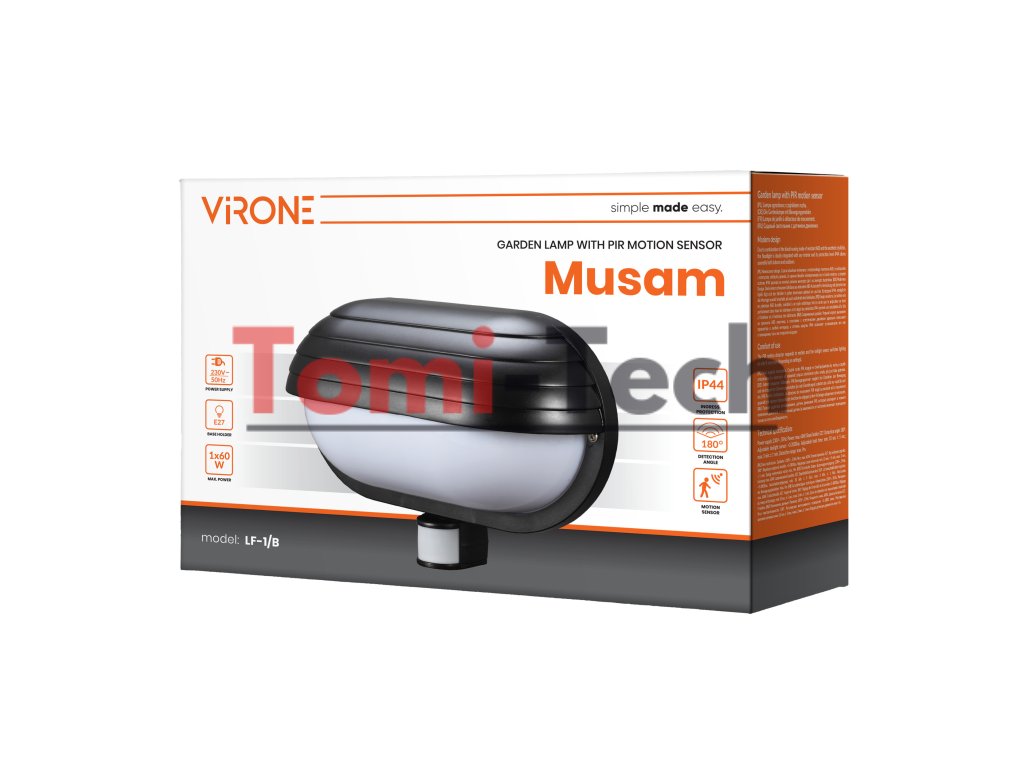 MUSAM, záhradná lampa so 180° pohybovým senzorom, 1x60W, E27, IP44, s clonou, plastová, čierna