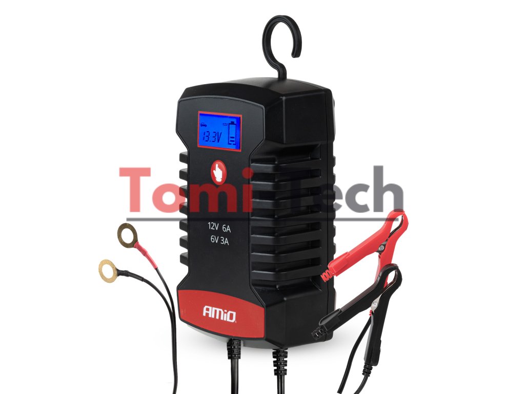 Digitálna nabíjačka AMiO PRO HOOK je moderné zariadenie určené na nabíjanie batérií AGM, GEL a LiFePo4 (LFP) . S maximálnym nabíjacím prúdom 6 A a podporou napätí 6 V a 12 V zaisťuje rýchle, bezpečné a presné nabíjanie batérií v osobných automobiloch, motocykloch, lodiach a malých profesionálnych zariadeniach. Nabíjačka je vybavená funkciou udržiavania napätia so zabudovaným hákom na zavesenie pod kapotu. Obsahuje rýchlospojku a ďalšie očká na konektory. Je ideálna na nabíjanie batérií motocyklov a osobných automobilov s benzínovými a maloobjemovými naftovými motormi a má tiež špeciálnu funkciu nabíjania batérií LFP.