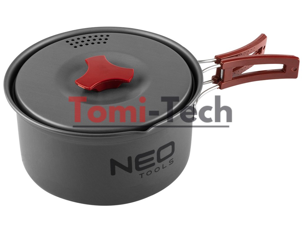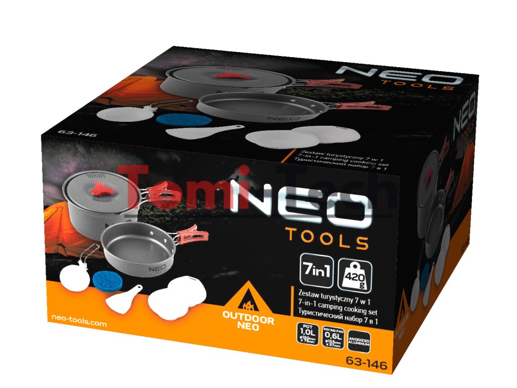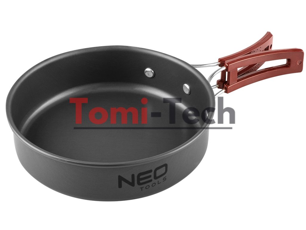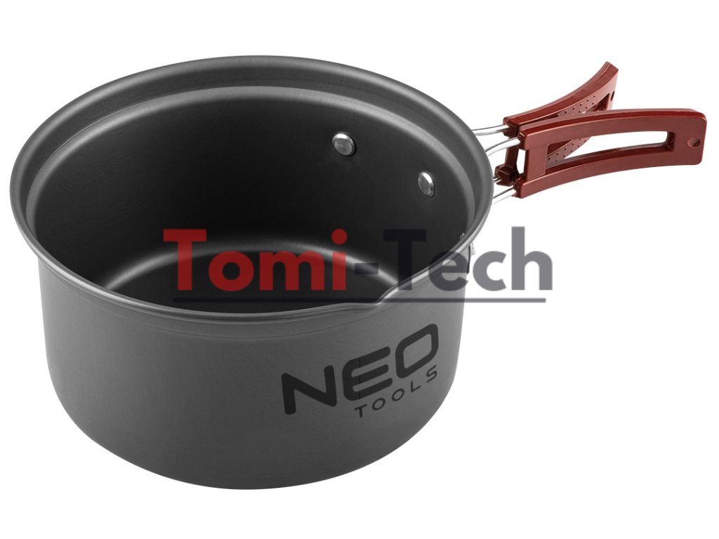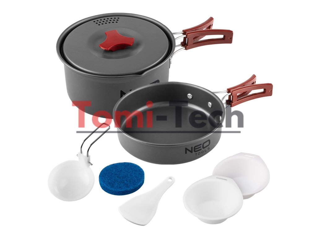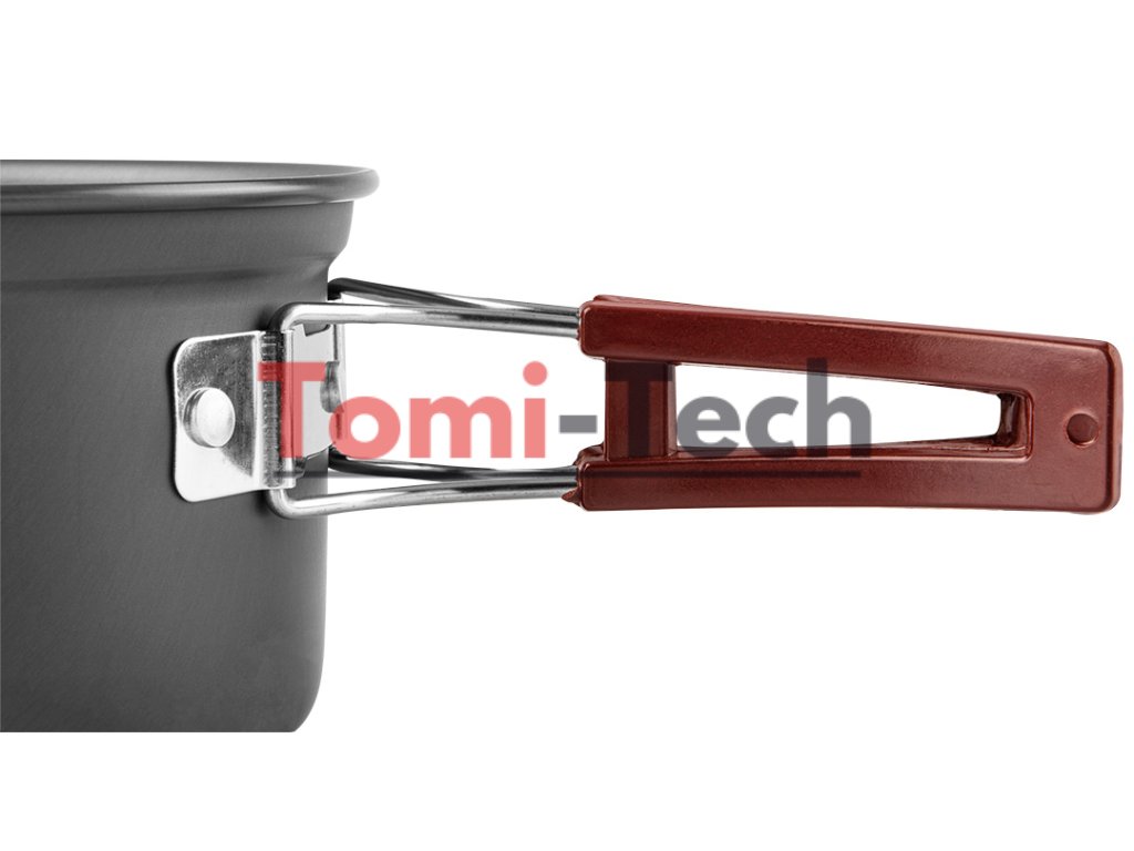 Cestovný riad 7 v 1: hrniec, panvica, 2x tanier, naberačka, špachtľa, špongia, hmotnosť 420 g, materiál hrnca a panvice: eloxovaný hliník, materiál tanierov, naberačky a špachtle: plast, skladací, izolované rukoväte, prenosná taška, objem hrnca: 1 l, objem panvice: 0,6 l, rozmery hrnca: priemer 150 mm, výška 75 mm, priemer panvice 155 mm, výška 37 mm, certifikát LFGB pre kontakt s potravinamiDodatočné parametre