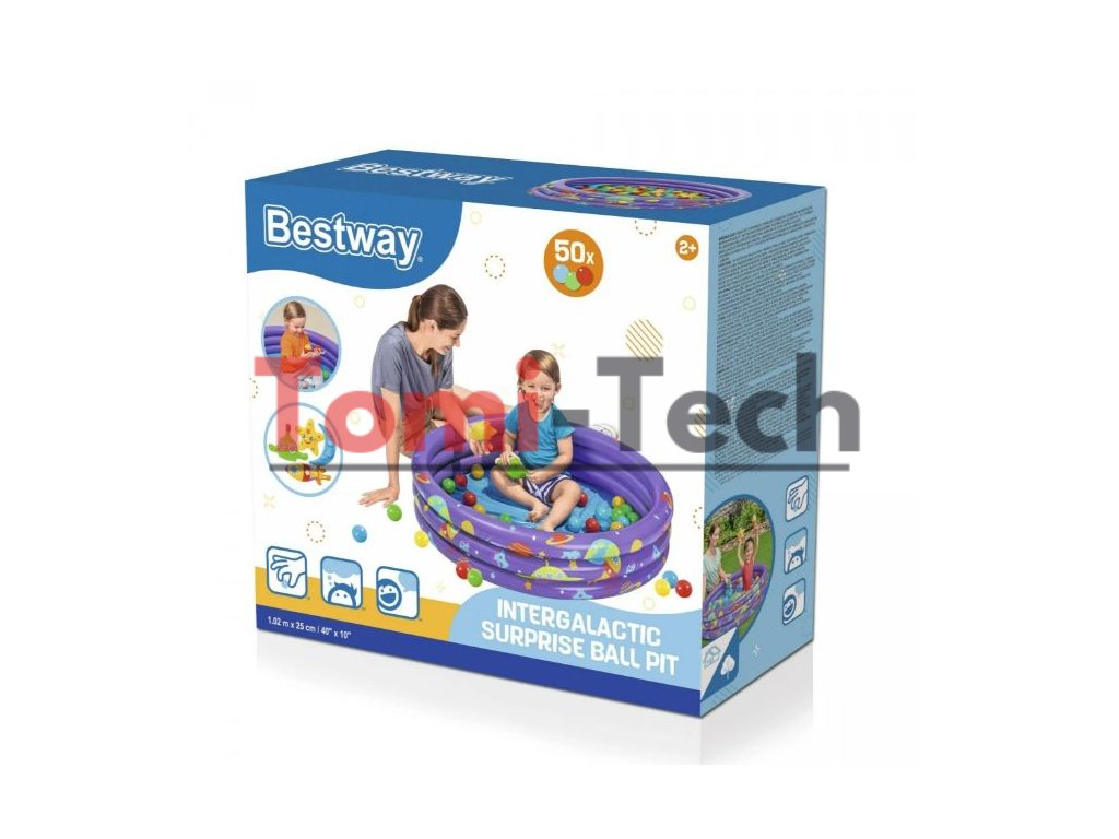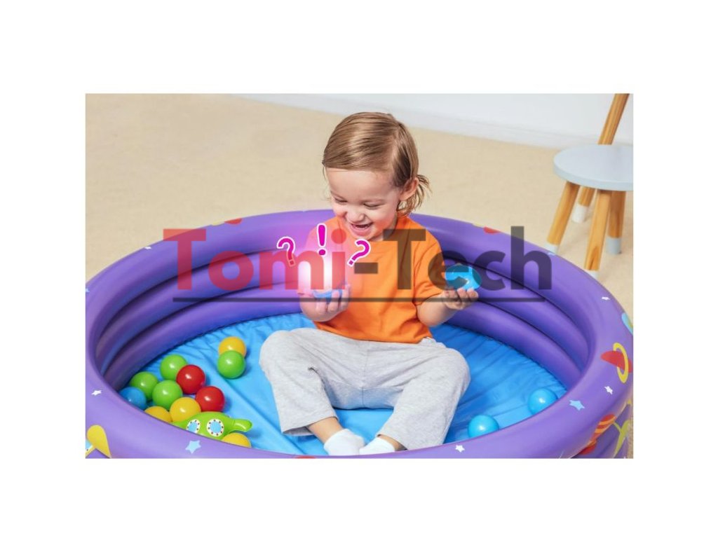 Hlavné vlastnosti bazéna Bestway:poistné ventily,predtým testovaný odolný vinylový materiál,tri rovnaké kruhy,päťdesiat farebných loptičiek v súprave,štyri ďalšie hračky,zahrnutá opravná záplata,objem: 101 l (27 galónov)