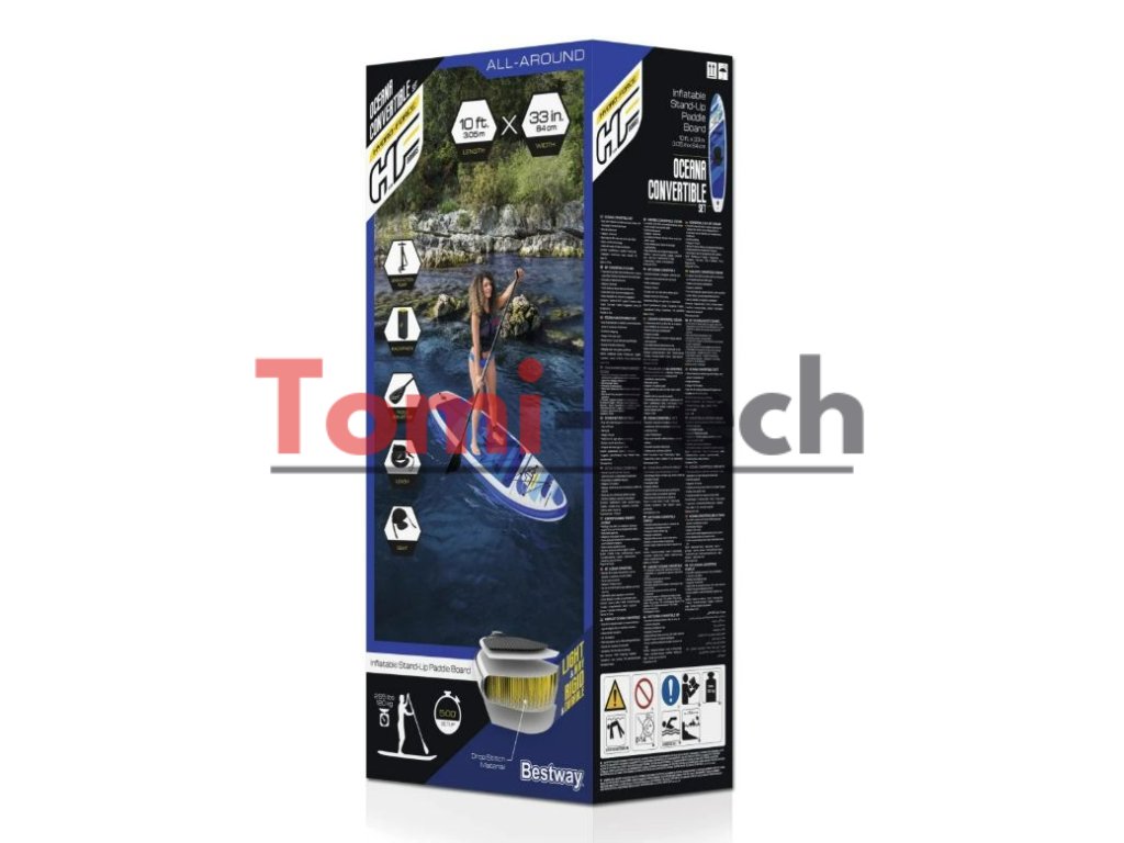 Špecifikácia: surfovacia doska pre 1 osobu, vyrobená zo špeciálneho materiálu Drop Stitch, ktorý je ľahký a odolný, povrchový materiál Tritech ™ podrobený testom odolnosti voči UV žiareniu, pohodlné, odnímateľné sedlo s opierkou na nohy, elastická šnúrka vpredu na zaistenie batožiny pri plávaní, pohodlná rukoväť pre ľahké prenášanie, protišmyková trakčná podložka