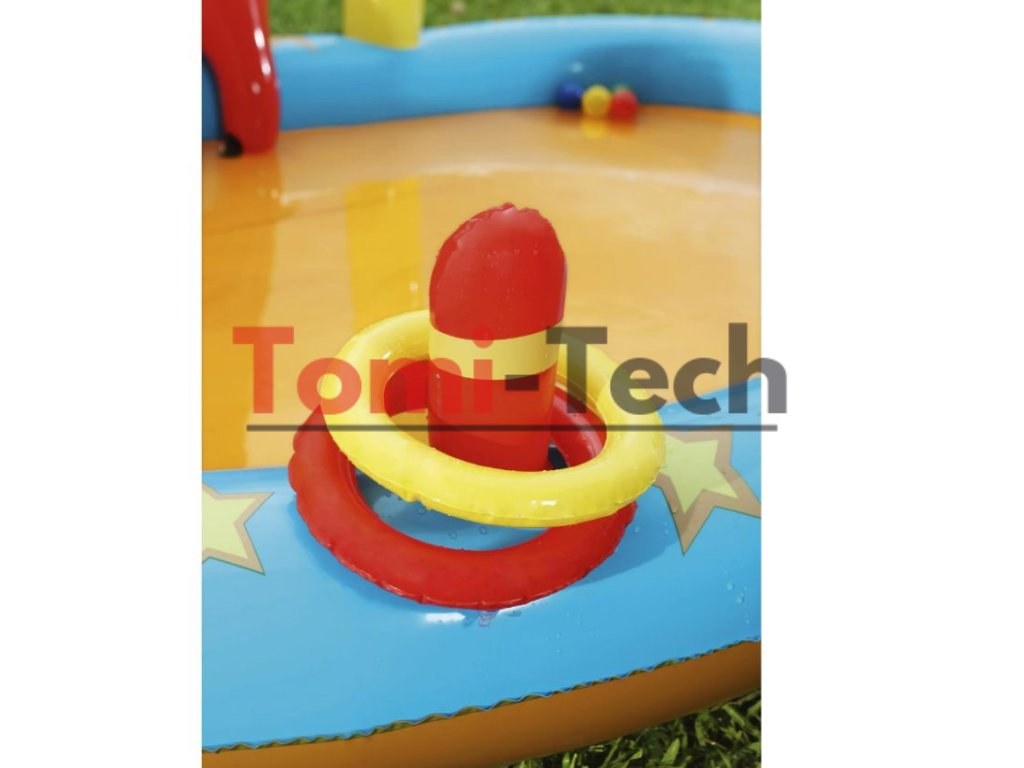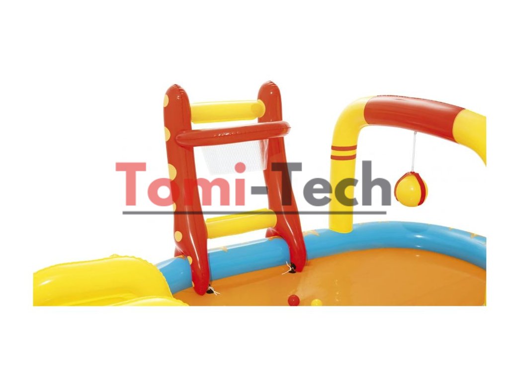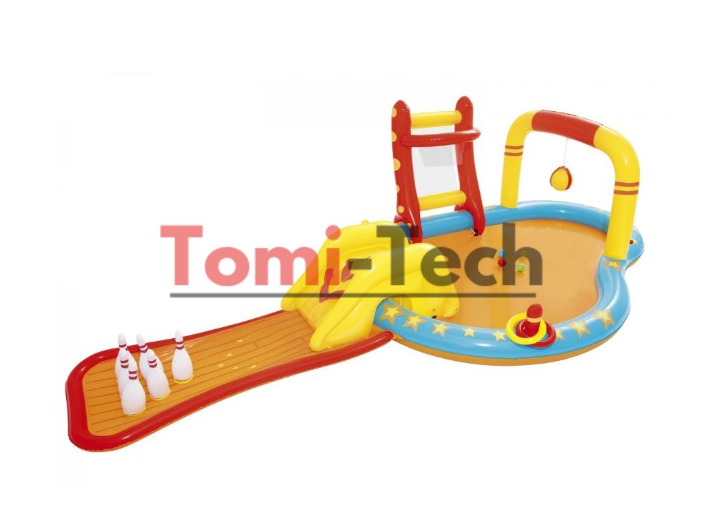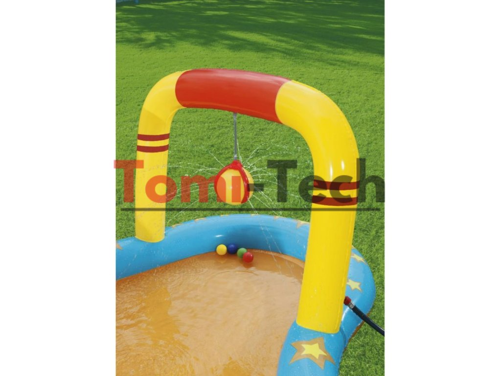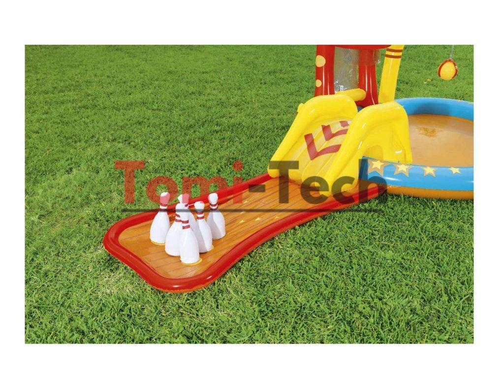 Bazén s nafukovacími atrakciami, ako je nafukovacia šmykľavka, vodná fontána, bowling, určite poteší vaše batoľa a stane sa jeho obľúbeným miestom na hranie. Bazén je vyrobený z mäkkého, no odolného materiálu a je maximálne bezpečný pre najmenšie deti. Hlavnými atrakciami sú nafukovacia šmykľavka a lopta, z ktorej po napojení na záhradnú hadicu potečie voda. Ihrisko môže využívať viacero detí súčasne, vďaka mnohým atrakciám si každé z nich nájde to svoje.