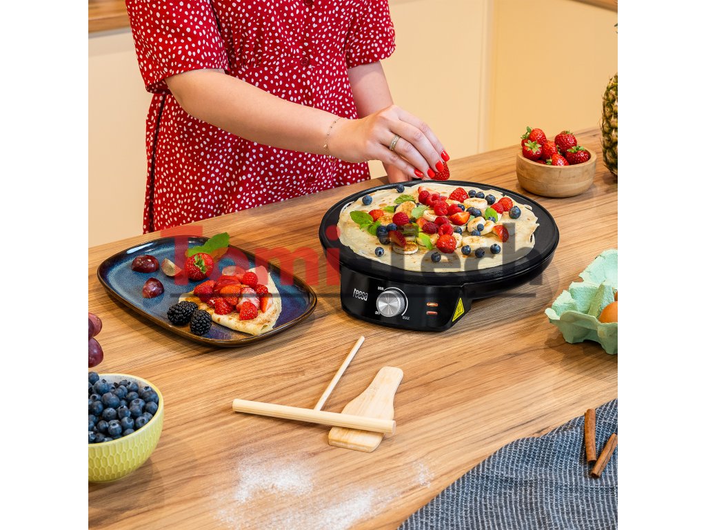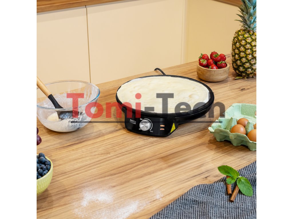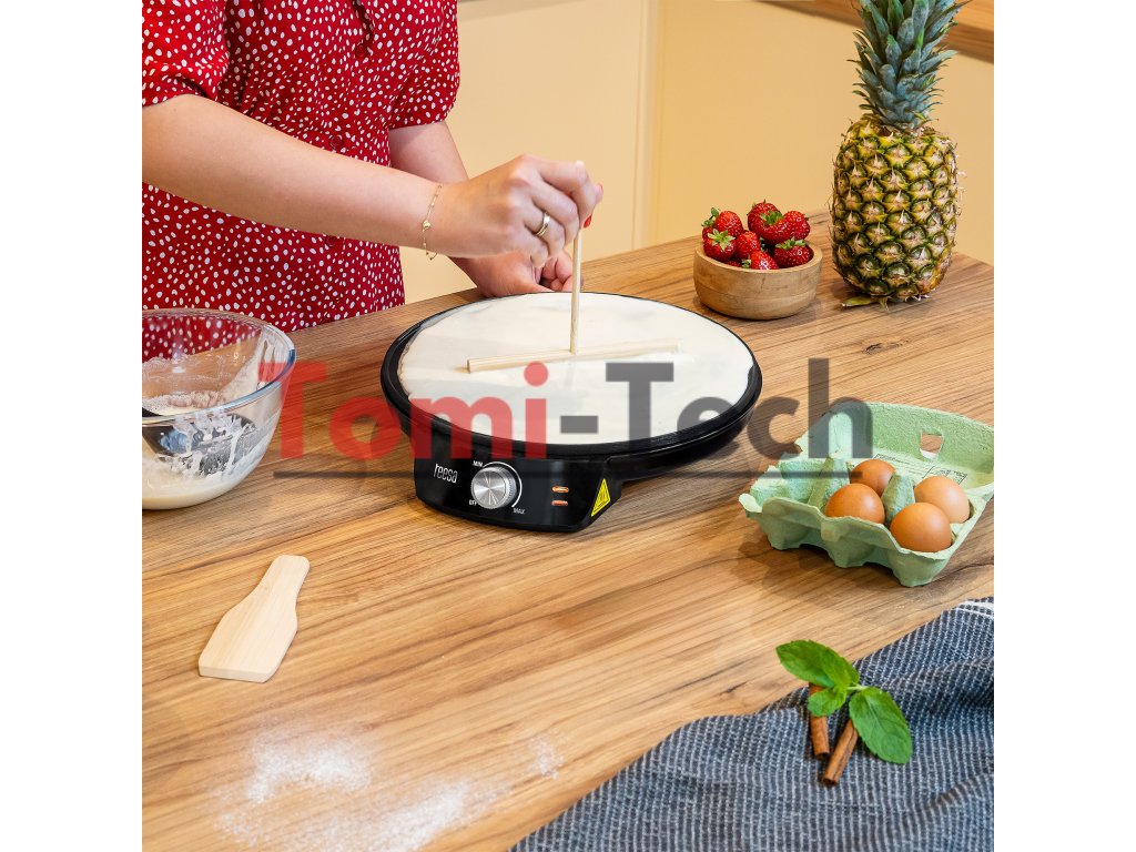 Špeciálny vykurovací povrch s priemerom 30 cm znamená, že sa nemusíte obávať prilepenia cesta. Palacinky sa vždy perfektne odlepia z taniera a budú rovnomerne upečené, čo zaručuje bezproblémovú prípravu.