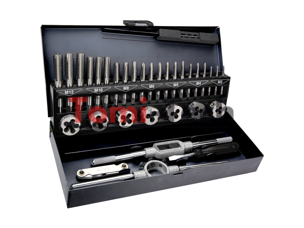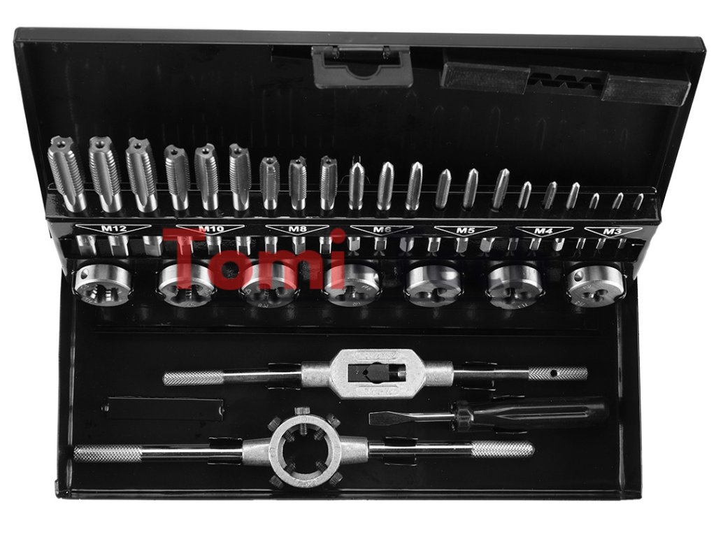 Závitníky a závitníky M3-M12, 32-dielna sada, volfrámová oceľ, DIN352 / DIN233, kovové puzdro, závitomer, skrutkovač na montáž závitníkovDodatočné parametre