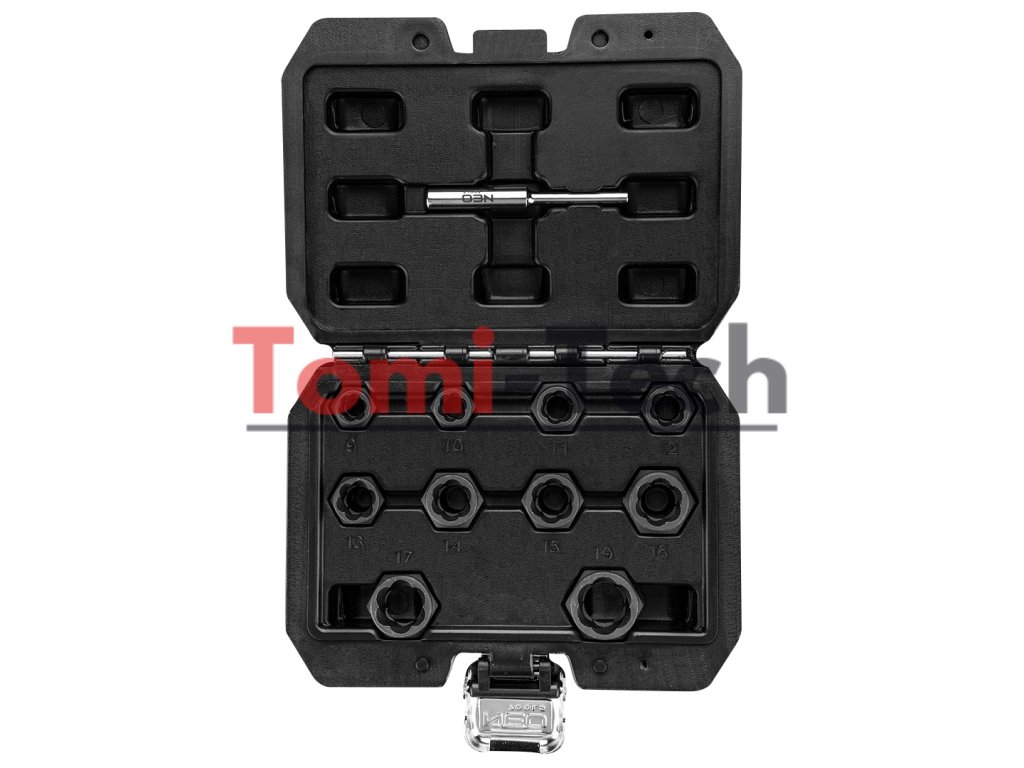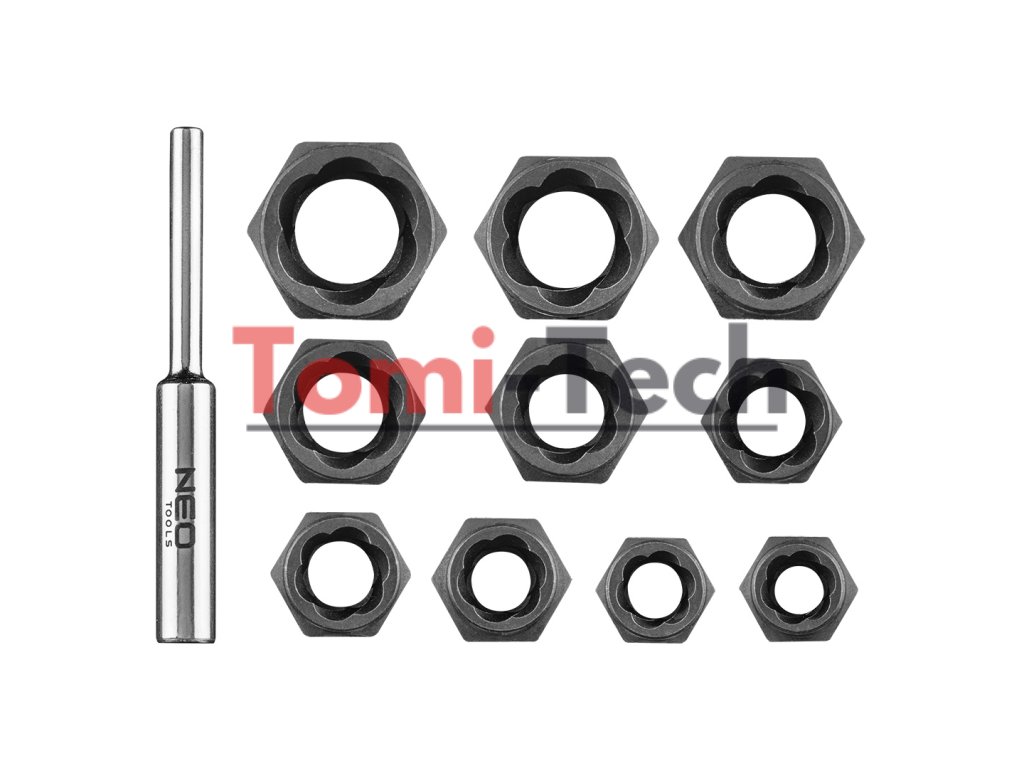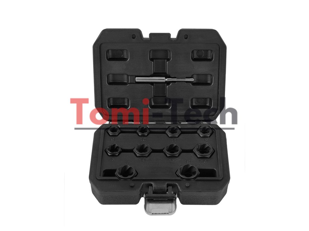 Nástrčkové kľúče na poškodené matice. Sada obsahuje: 9, 10, 11, 12, 13, 14, 15, 16, 17, 19 mm, 1 kolík. Vnútorná špirála sa automaticky utiahne na poškodenú skrutku/maticu, čo umožňuje bezpečné odskrutkovanie.Dodatočné parametre