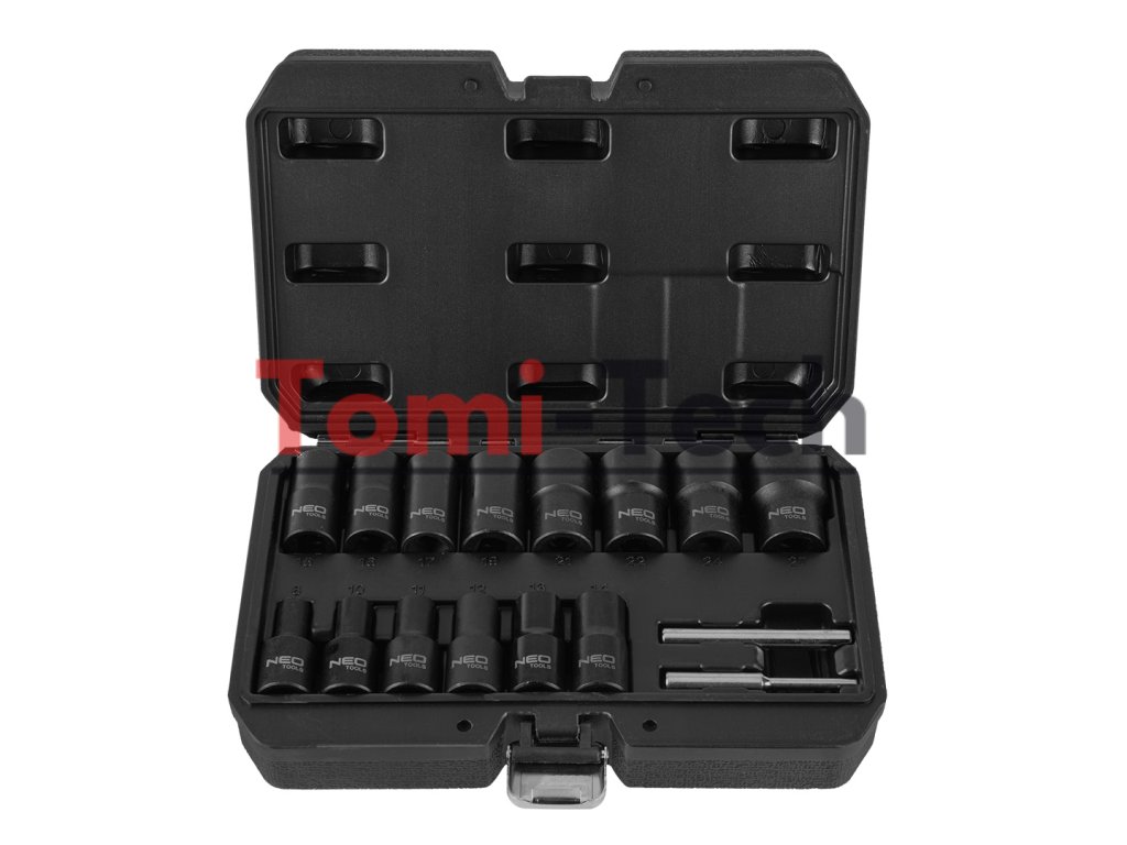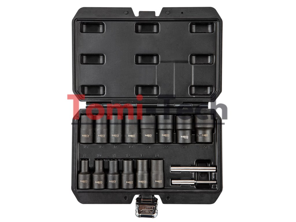 1/2" objímky na poškodené matice. Sada obsahuje: 8, 10, 11, 12, 13, 14, 15, 16, 17, 19, 21, 22, 24, 27 mm. 2 vyťahovacie hroty na vyťahovanie skrutiek z objímok. Možno použiť s rázovými uťahovákmi. Vnútorná špirála spôsobuje samoupínanie poškodenej skrutky/matice, čo umožňuje bezpečné odskrutkovanie.Dodatočné parametre