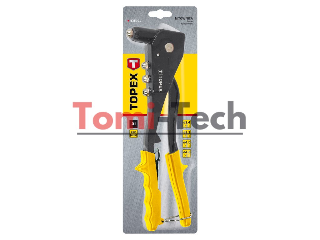 Nitovač na hliníkové nity 2,4, 3,2, 4,0, 4,8 mm, 4 hroty, dĺžka 260 mm, oceľová páka, hliníkové telo, otvorený kľúčDodatočné parametre