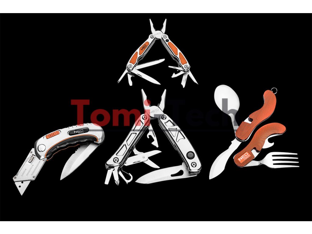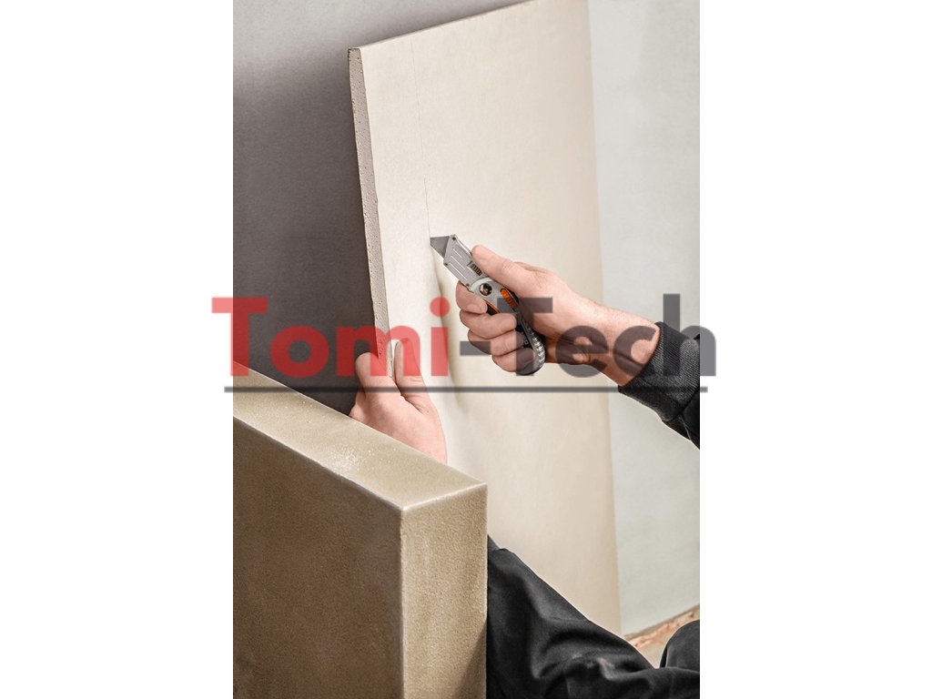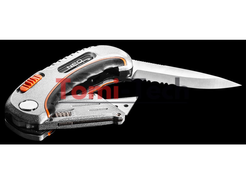 Skladací úžitkový nôž, dva hroty - lichobežníkový a montážny, telo z dvoch materiálov, bezpečnostná spúšť, nylonové puzdro, súčasťou balenia 5 lichobežníkových čepelí, poistka proti neočakávanému zatvoreniu.Dodatočné parametre