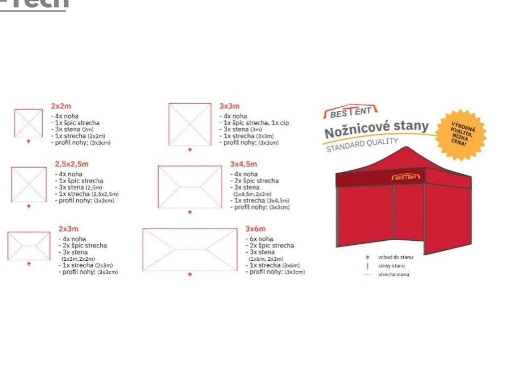 Nožnicový stan standard quality obsahuje konštrukciu, 3 steny a strechu. Rada Standard Quality má strechu stanu so suchým zipsom po celej dĺžke a taktiež aj bočné steny. Táto rada sa perfektne hodí na akcie, kde potrebujete zabezpečiť uzavretie stanu bez prietoku vzduchu do vnútra.