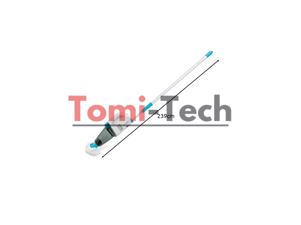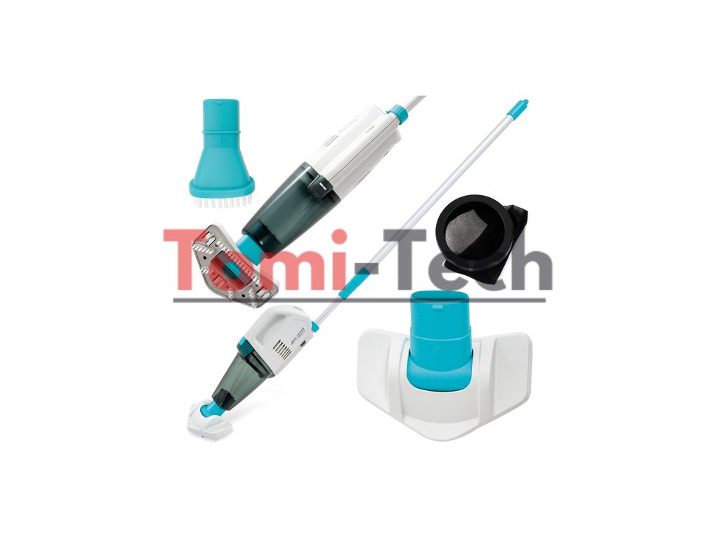 bezdrôtový - práca s vysávačom znamenáúplnú slobodu pohybu pri čistení bazéna, pohodlne sa dostanete do každého zákutia a štrbiny bez ohľadu na tvar nádrže a budete si môcť užívať pohodlnú a efektívnu prácu. Jednoduché použitie - stačí ho zapnúť a ponoriť do vody a automaticky sa spustí. Po vybratí z vody sa automaticky vypne, čo nielen uľahčuje používanie, ale tiež chráni batériu a motor pred poškodením. Špecifikácie vysávača: Zodpovedá európskym normám Bezdrôtový ručný vysávač do bazénov a víriviek Kompatibilný s nadzemnými bazénmi s priemerom do 5,49 m Ľahká, teleskopická tyč umožňuje jednoduché nastavenie dĺžky (97-239 cm) na ťažko dostupných miestach 2 vymeniteľné vysávacie hlavice na čistenie rovných stien alebo rohov