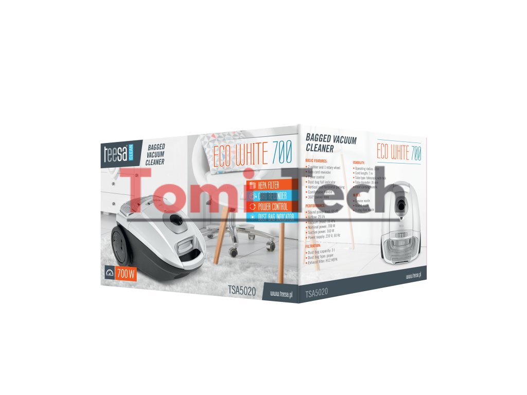 Vreckový vysávač ECO WHITE 700 s nominálnym výkonom 700 W je zariadenie, ktoré sa perfektne hodí do každej domácnosti. Vysávač je neuveriteľne tichý a nastaviteľný sací výkon znamená, že môžete bez obáv vysávať akýkoľvek povrch. 7-metrový napájací kábel umožňuje široký akčný rádius bez nutnosti prepínania do inej zásuvky.