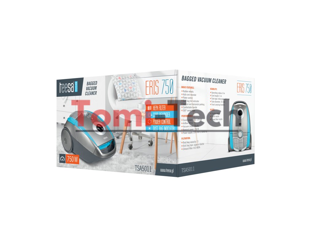 TEESA ERIS 750 je malý a ľahký vreckový vysávač, ktorý vám s výkonom 750 W pomôže pri každodennom upratovaní. Pohodlný vertikálny a horizontálny parkovací systém, ako aj teleskopická trubica s aretáciou predĺženia, vám poskytnú veľký komfort pri čistení. Gombík na nastavenie výkonu vám umožní bez obáv vysávať akýkoľvek povrch. Platí to najmä preto, že sada obsahuje ďalšie hubice – štrbinovú hubicu, veľkú dvojstupňovú hubicu a malú hubicu s nadstavcom na parkety. Navyše, ak sa vrecko začne plniť, špeciálny indikátor vás bude informovať, že je potrebné ho vymeniť.